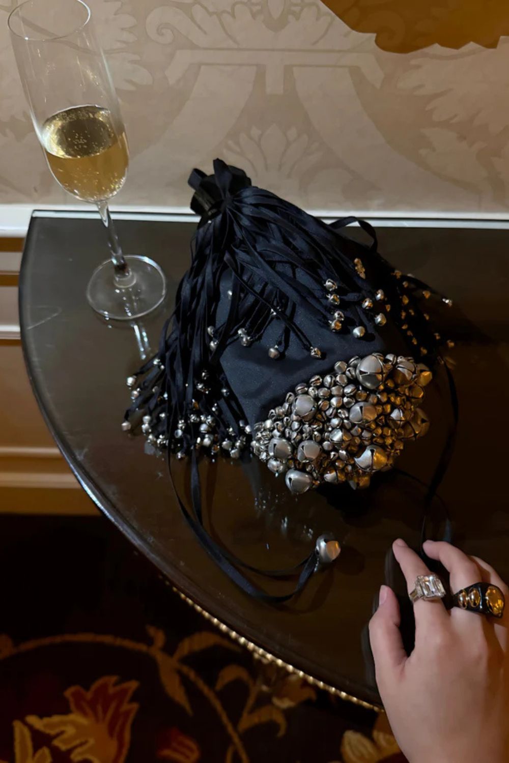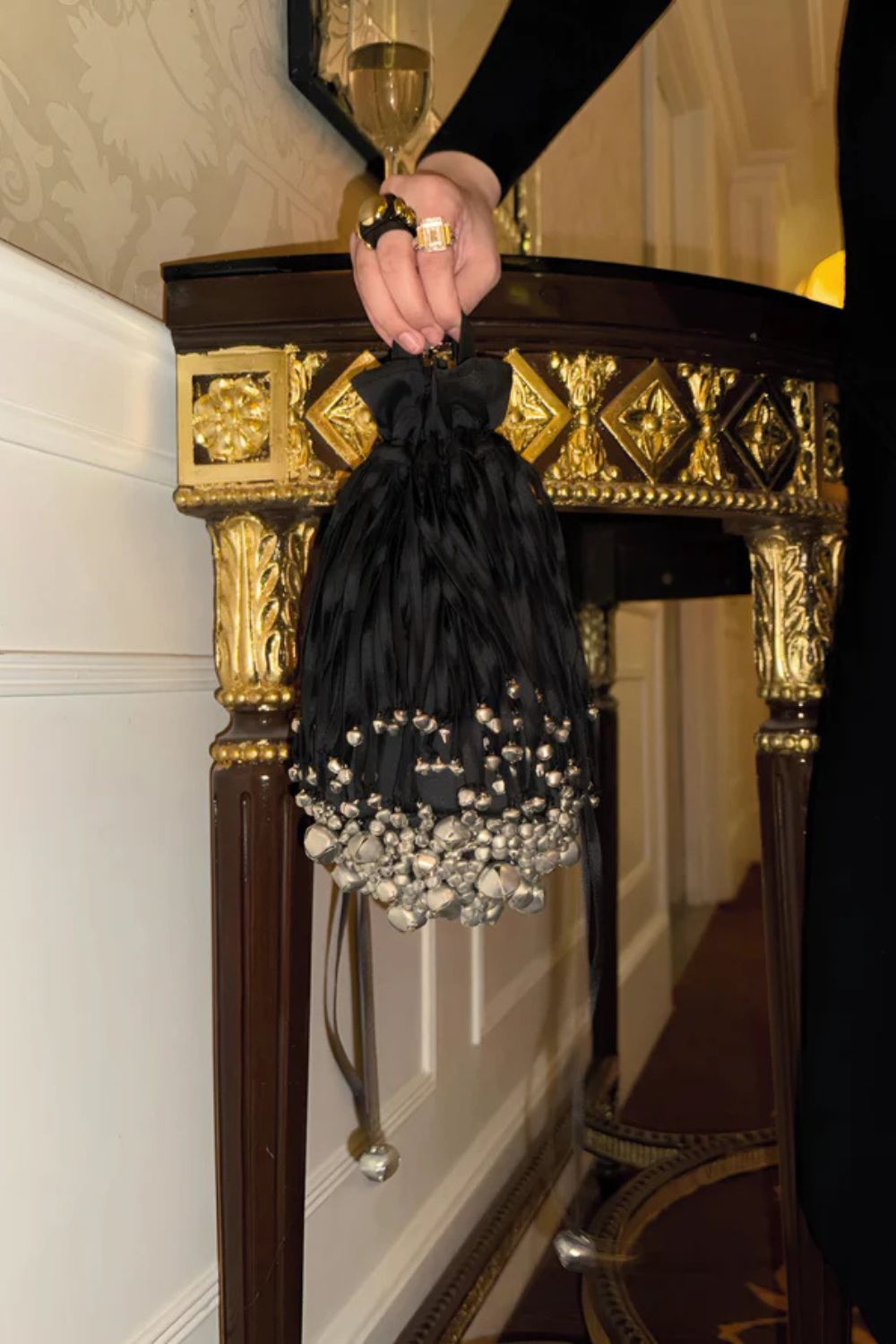 The Lennon Rocky Bucket Bag is fashioned in black taffeta. The synchrony of the many silver ghungroo that deck its concave bottom, and the black taffeta fringes with ghungroo endings - creates an irresistibly fun experience every-time you wear it.