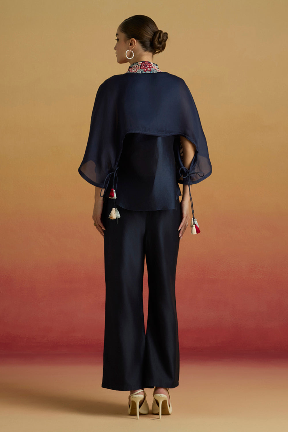 Indigo chanderi and silk organza paisley threadwork and beadwork layered shirt.