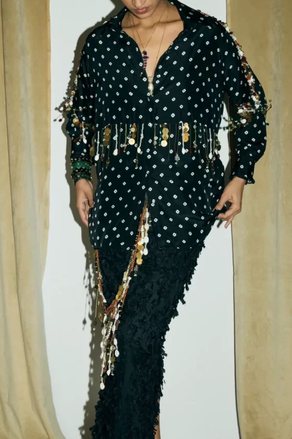 Hand printed Bandhani silk shirt embellished with tribal inspired embroidery. It has front closure and a cuff.