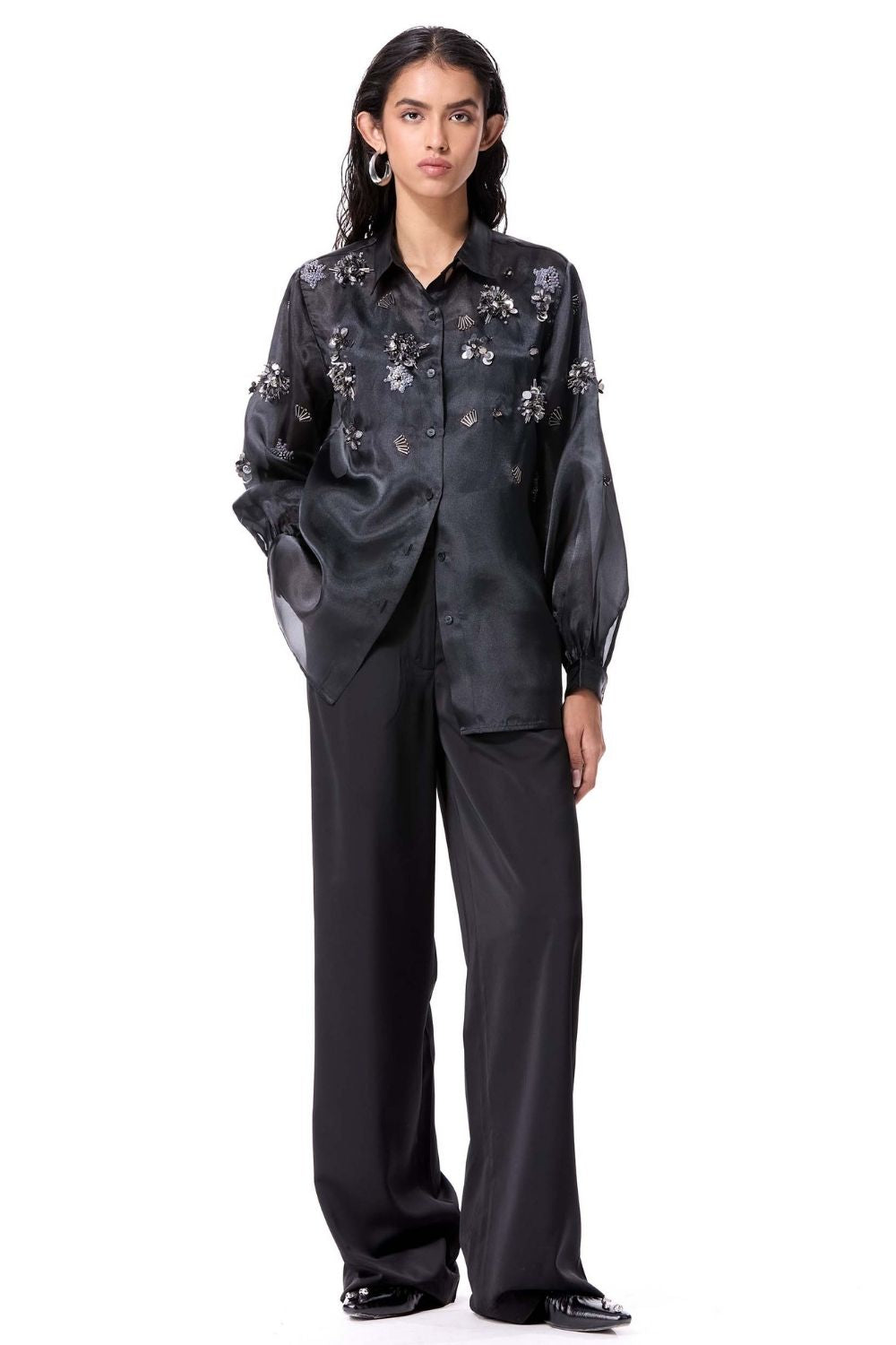 Black pants with front button closure.
