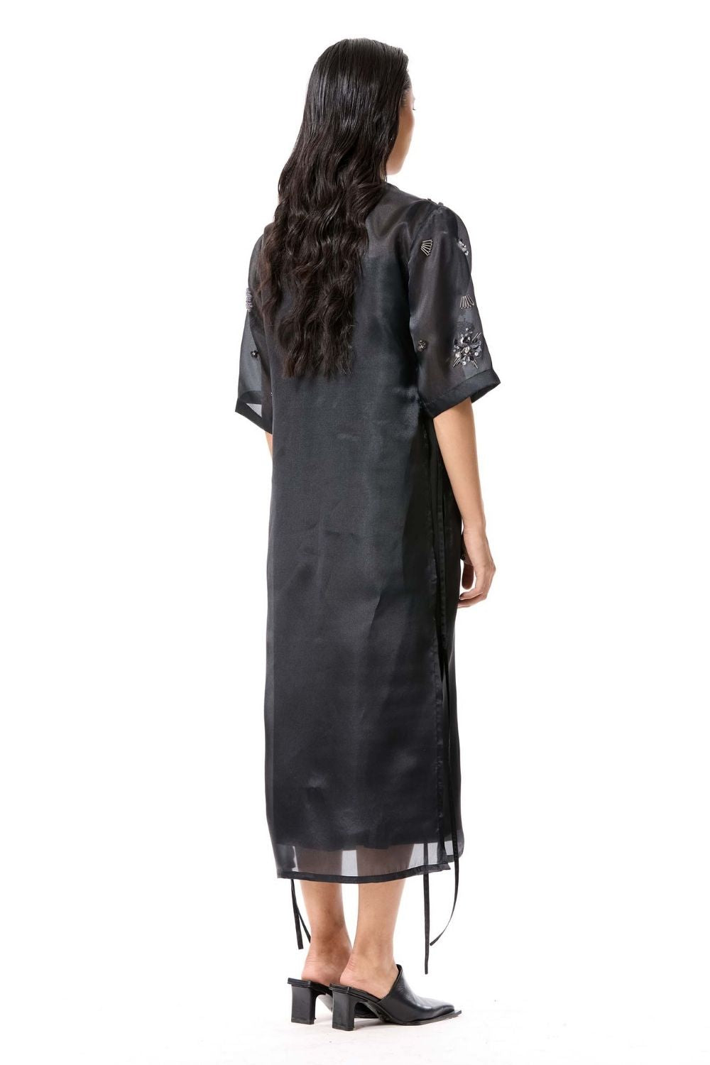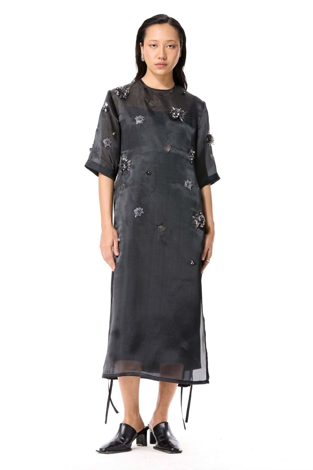 Black hand embellished midi dress with drawstring tie detail on the sides..