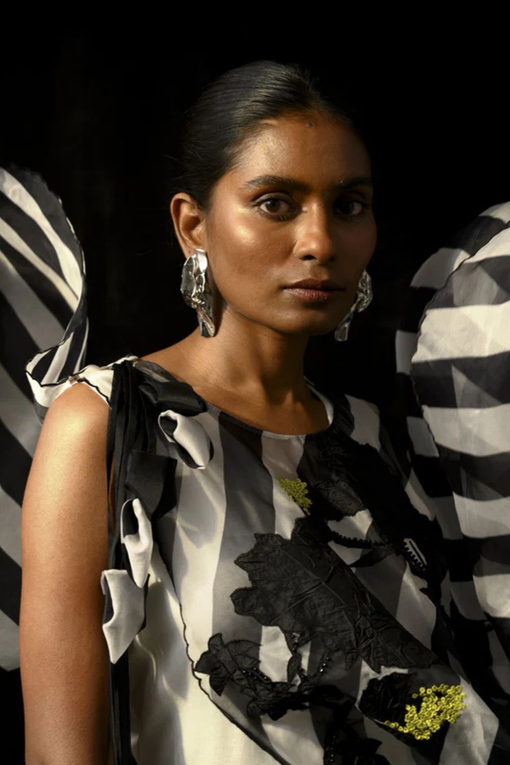 Modal satin jumpsuit with printed & appliqued organza attached.