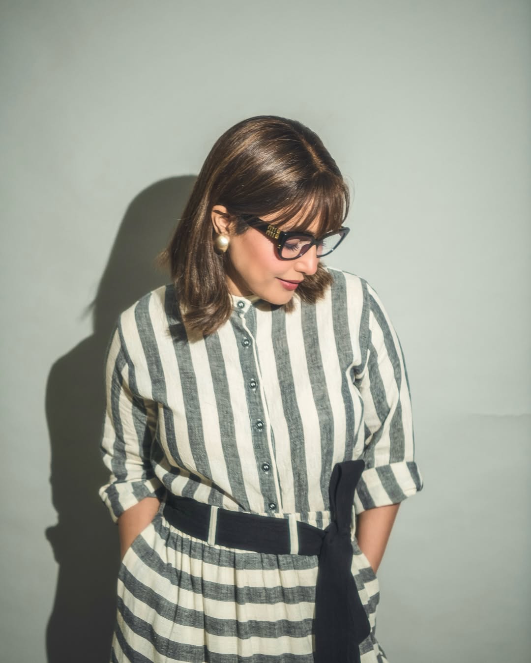 Farah crop shirt with band collar, straight sleeves and drawstring at the hem paired with diagonal frill midi skirt with elasticated waistband, side pockets, and a belt.