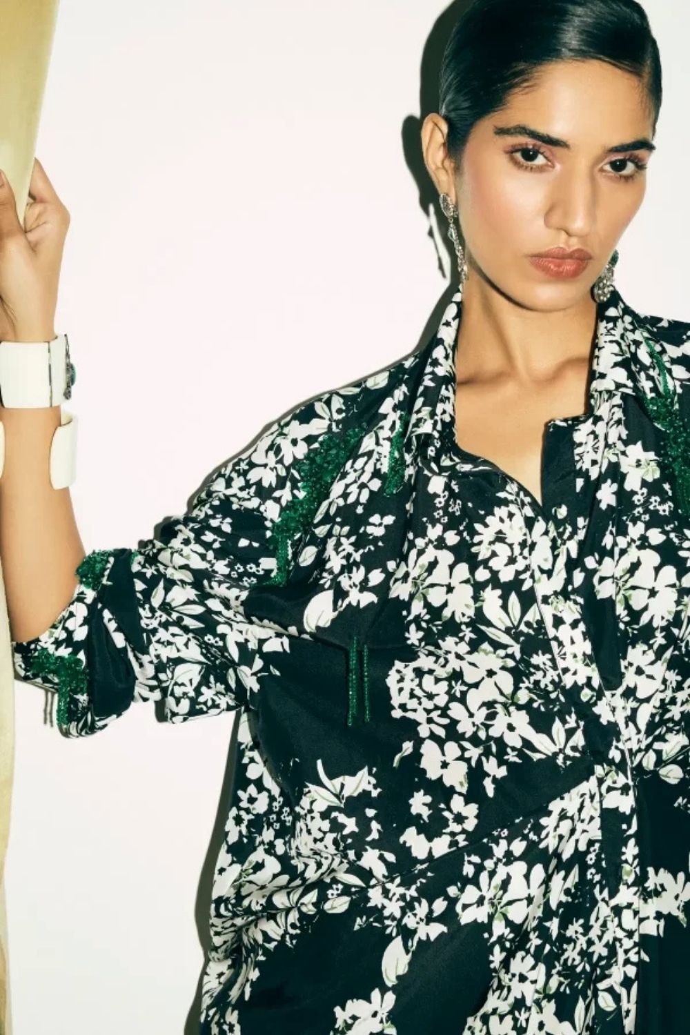 Hand printed silk shirt with an abstract floral print with tucks, front closure & cuff. It is embellished with green crystals and jewel beads.