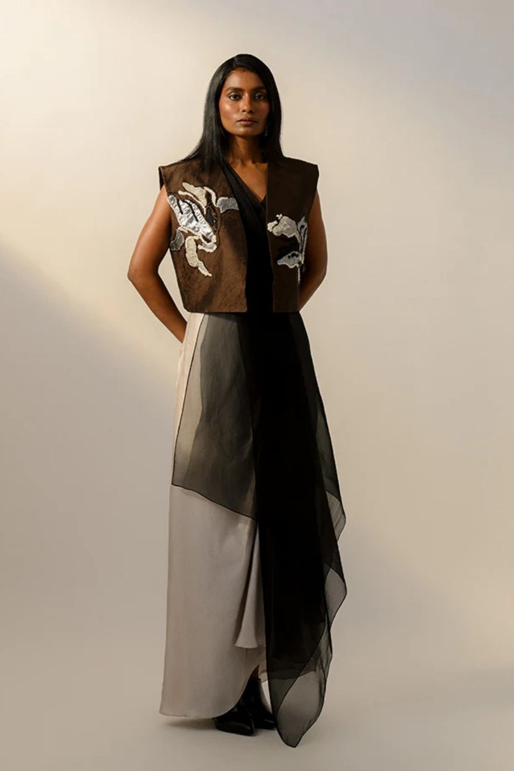 Brown crush embroidered boxy jacket with organza draped scuba inner & modal satin drape skirt.