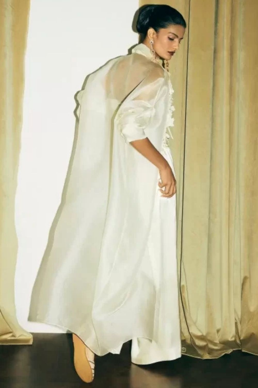 A heavy satin corset embellished with pearls and cut shells paired with an organza jacket with pearl appliques and hangings on the collar. Broad satin pants to pair with it.