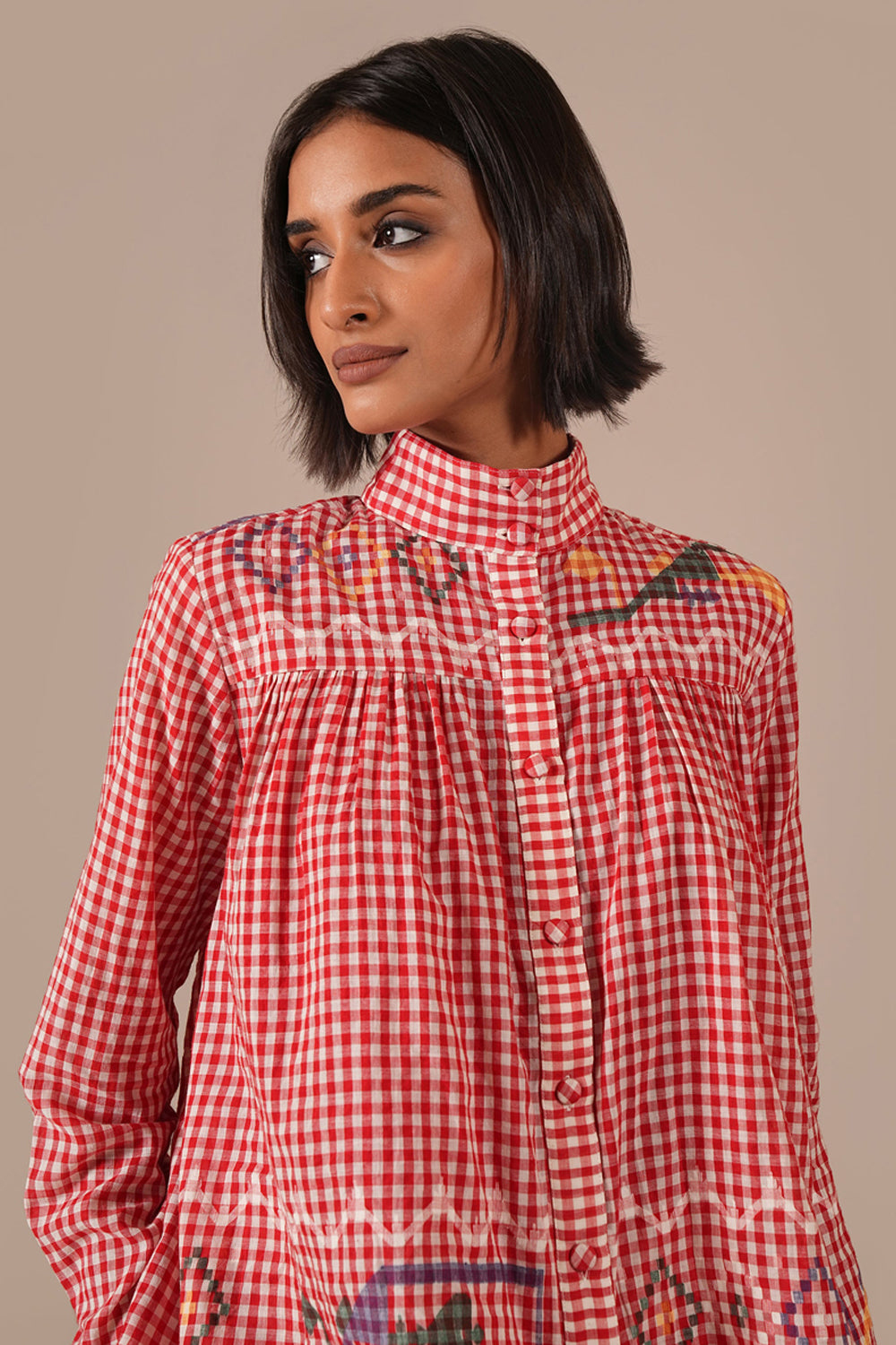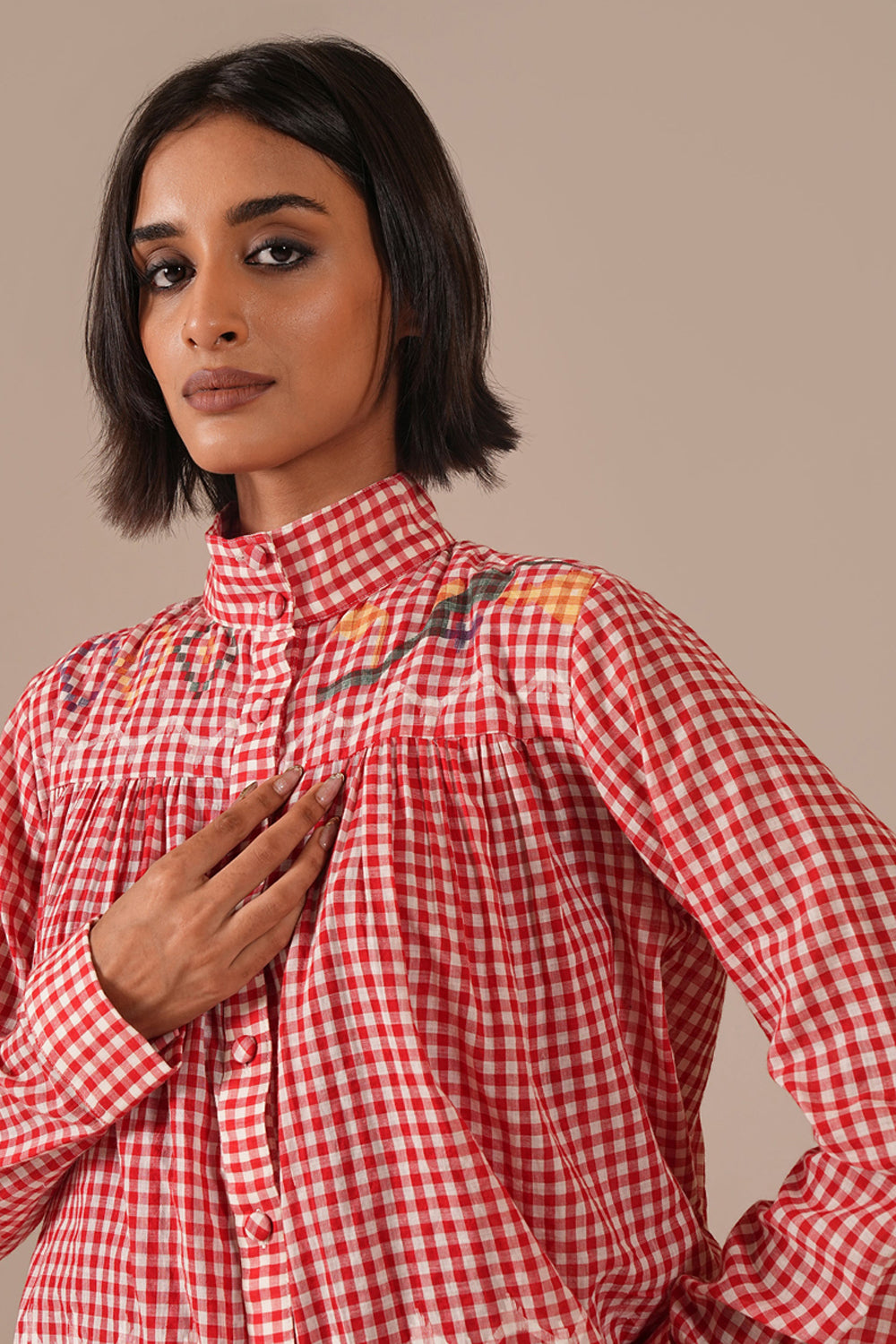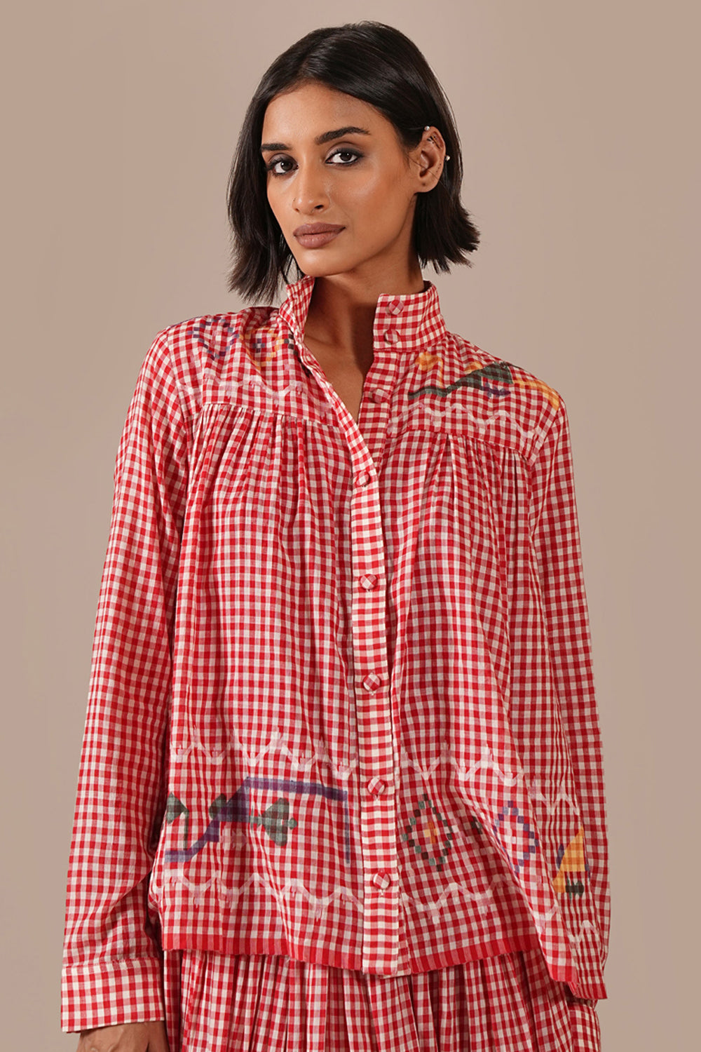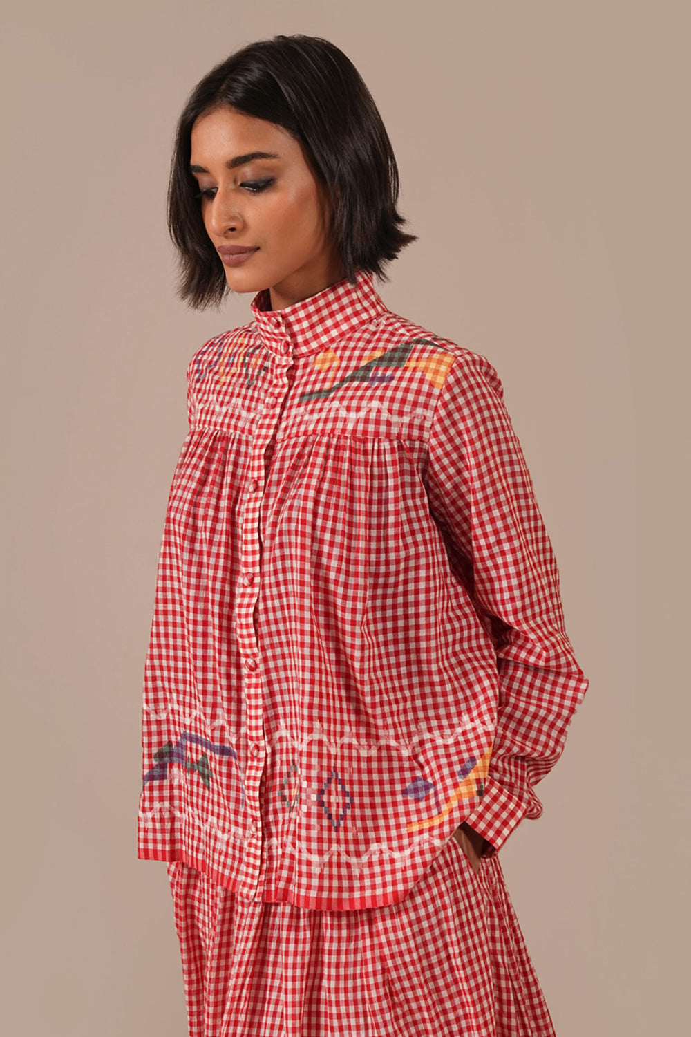 A handcrafted Jamdani ensemble with a gathered skirt, side zipper fastening, side pockets, and a co-ord high-collared shirt effortlessly refined and timeless.