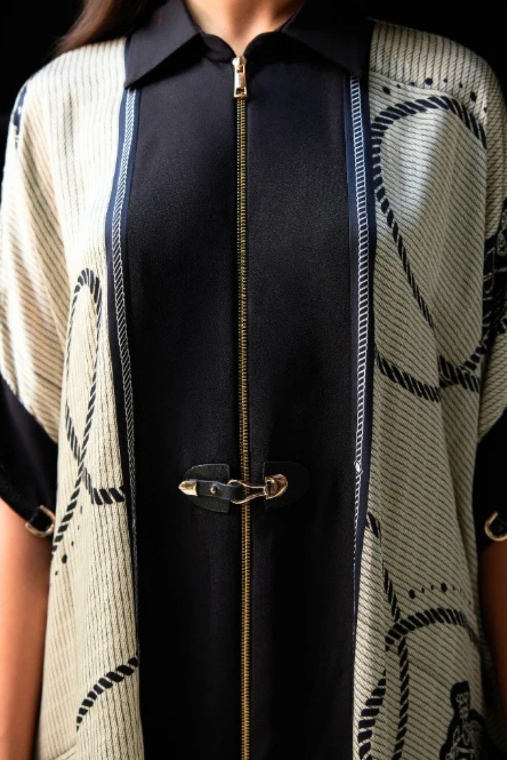 The elegance of ivory meets the subtle authority of black in this jacket—where structure flows into ease. A silhouette that bridges the worlds of day and dusk, its fluid lines and tailored centre zip speak of quiet confidence.