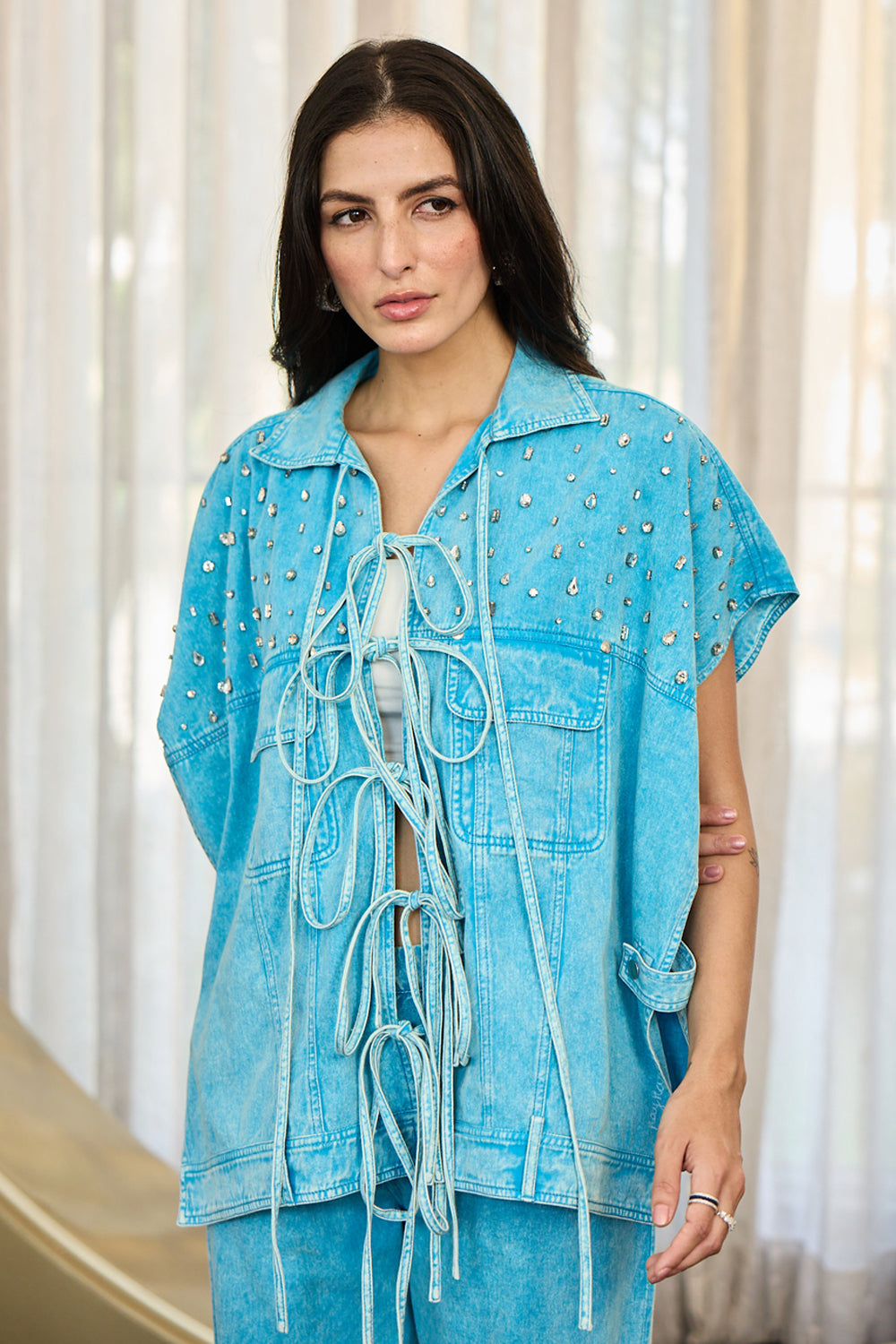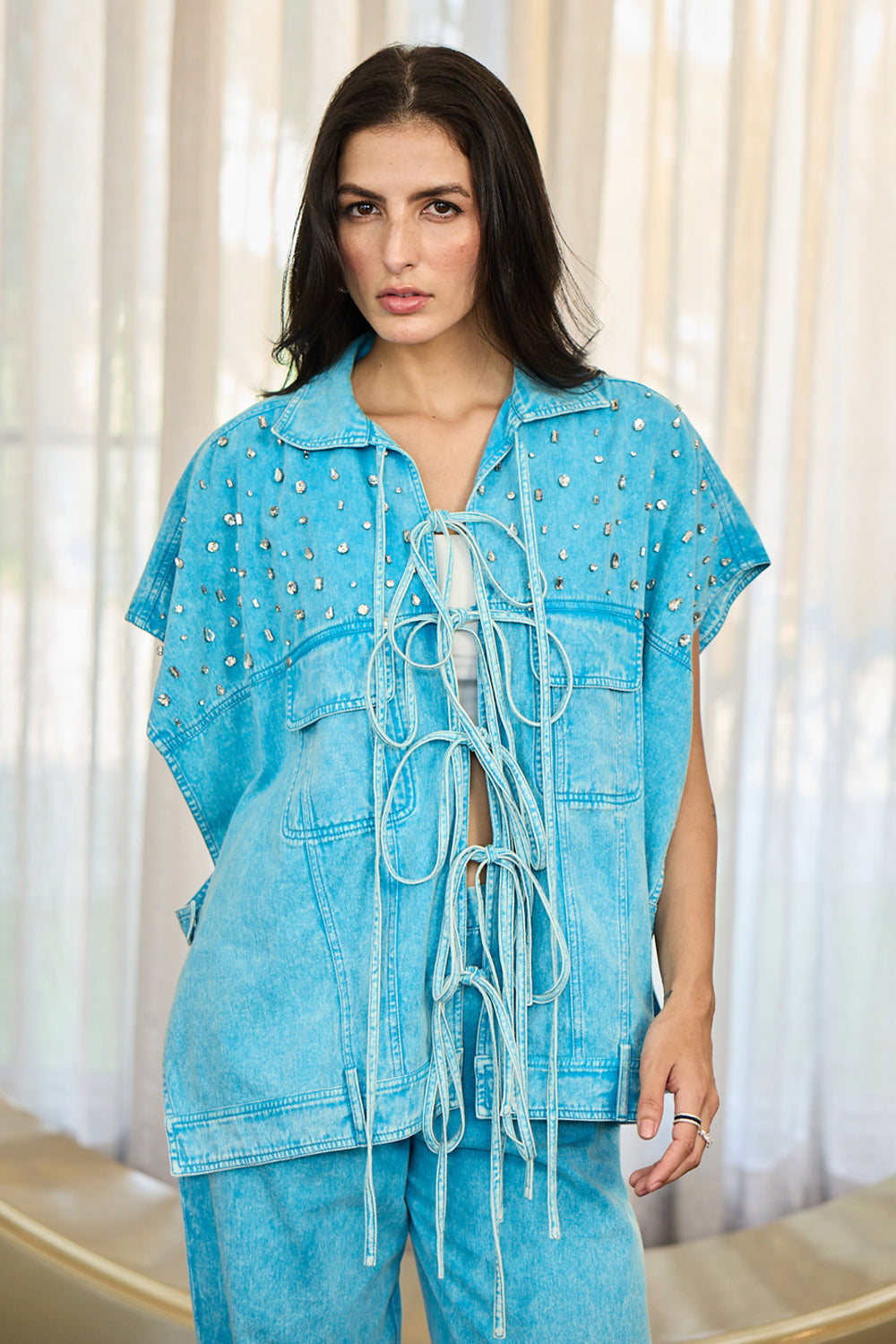 Fresh and breezy, this sky blue denim coord set brings a playful twist to everyday dressing. The soft hue and relaxed fit create an effortlessly chic, all-day look.
