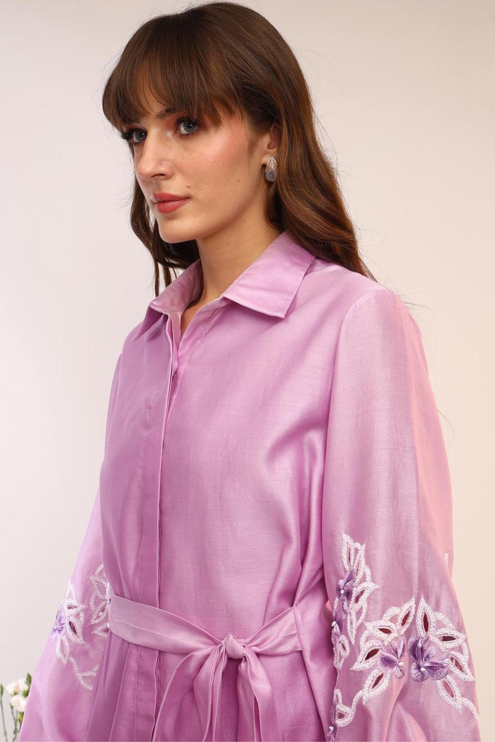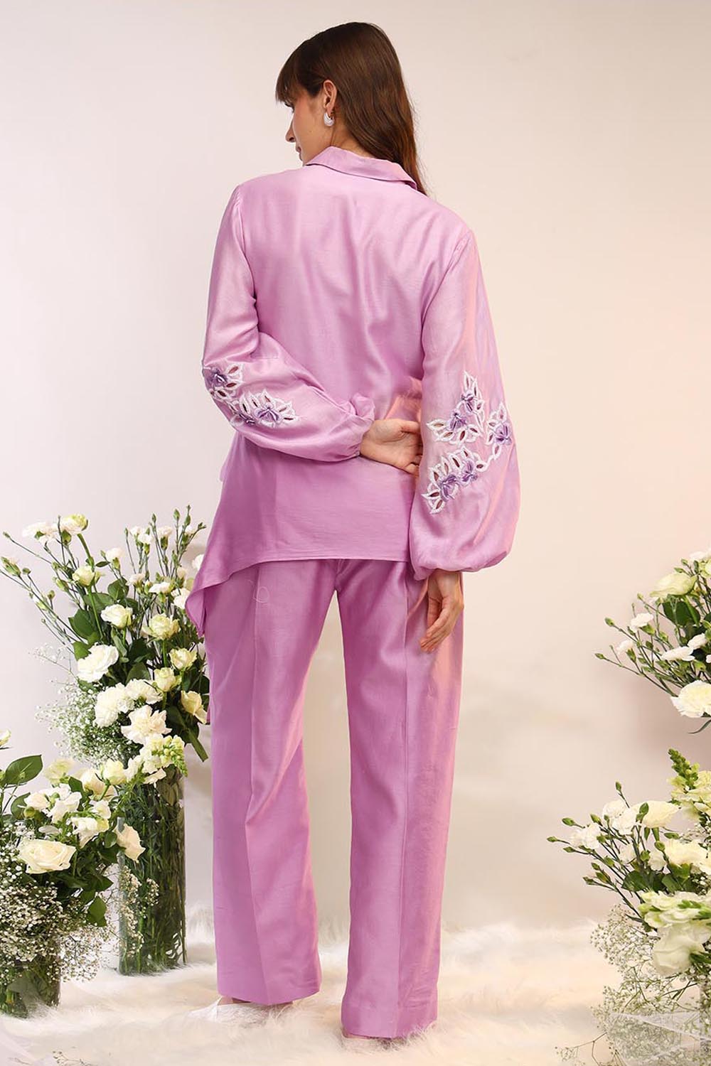 Asymmetric Tie Up Shirt With Intricate Embroidered Sleeves. Paired With Straight Creased Pants.