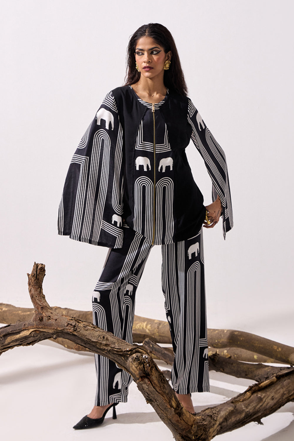 Colour blocked front open free sz cape top with placement print, embellished with a metallic gold zip in the front.