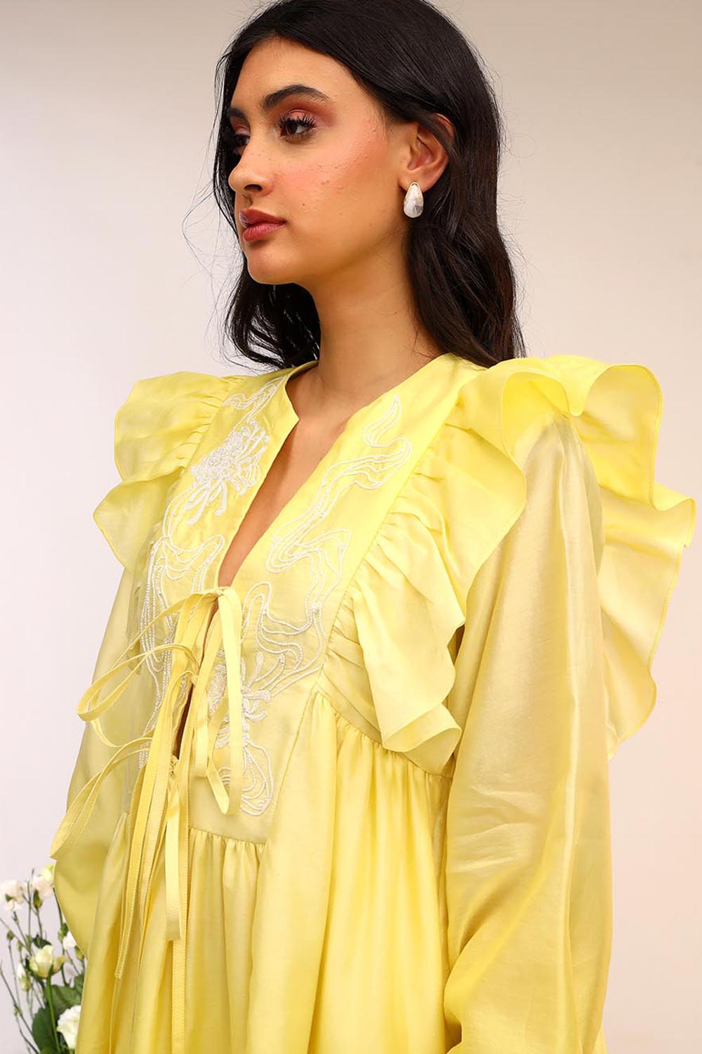 Short tie up dress with embroidered floral yoke, elasticated sleeves and ruffle detailing.
