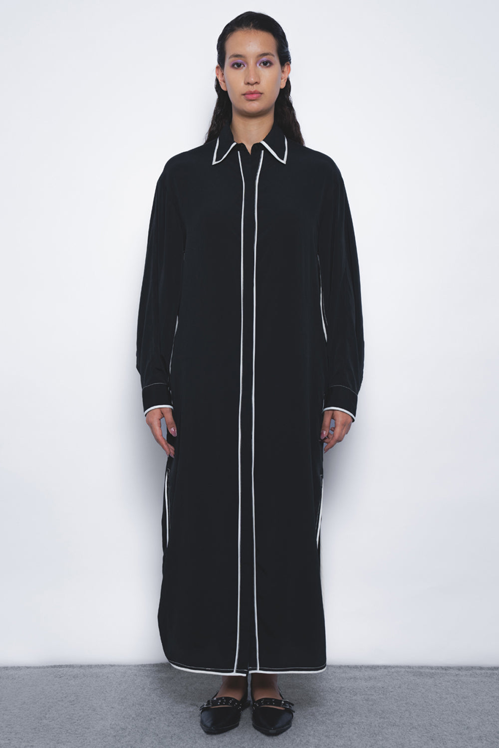 A classic tailored shirt dress is redefined with a playful edge at the sleeves, accentuated by contrasting piping. The silhouette remains minimalist and formal, elevated with a modern touch.