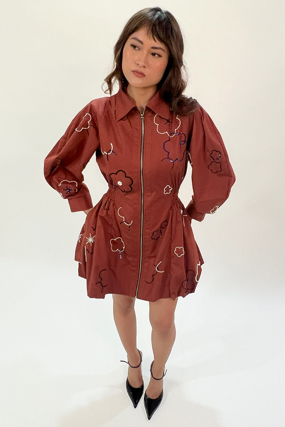 This mini bubble hem dress features intricate bead and sequin floral embroidery that adds a touch of sparkle and sophistication to the design. It has a front zipper for easy wear, and a back elastic waistband that ensures both style and comfort, offering a fitted look with flexibility. The structured sleeves enhance the dress's shape.