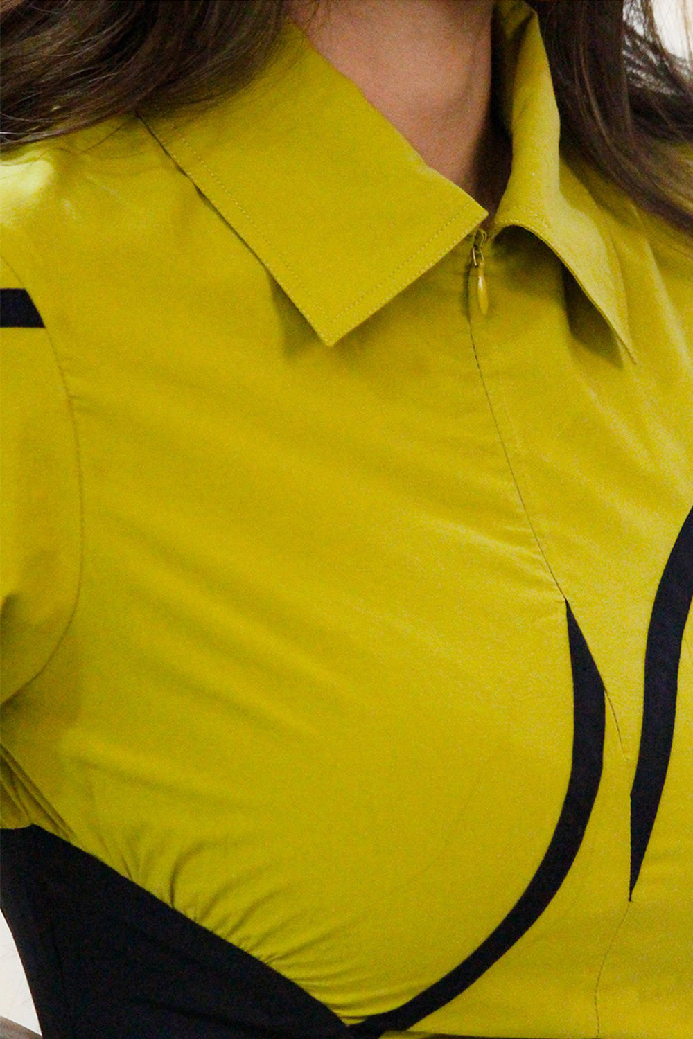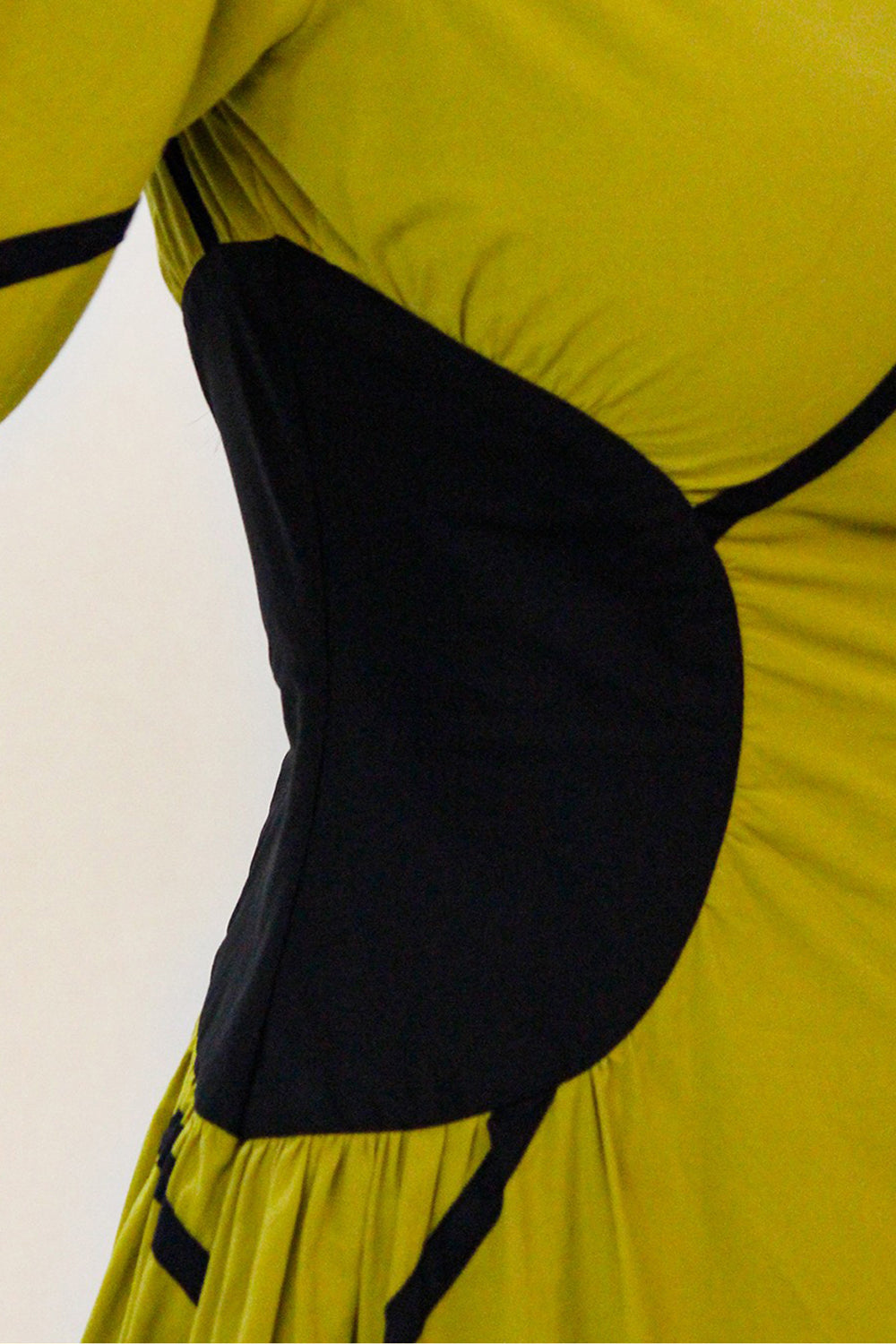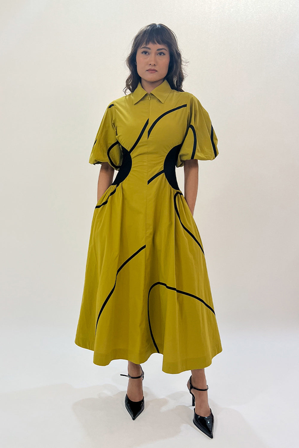 A timeless silhouette, this midi dress with contrast side panel and stem tapes is designed to be fitted through the waist and flare toward the hem. Complimented with inseam pockets at side, pleated puff sleeves and soft pleats through the skirt finished off with front and side conceal zip closure.