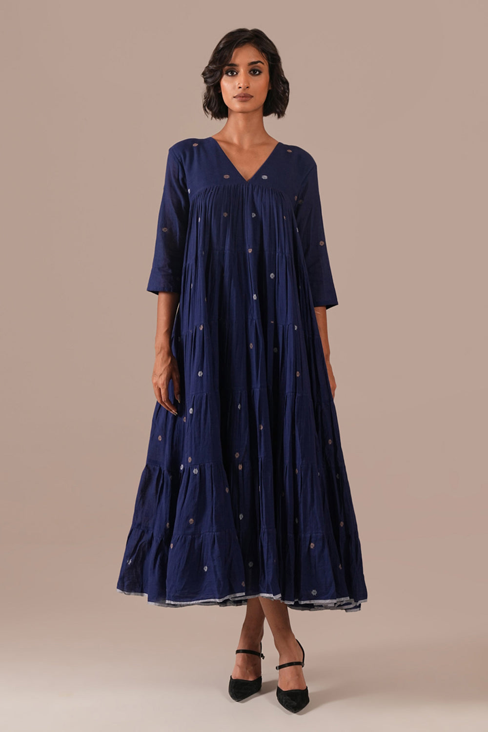 An elegant Jamdani swing dress designed to dazzle, featuring a V-neck, and 3/4th sleeves. With a romantic, voluminous silhouette crafted from 9 to 10 meters of gathers, this dress flows beautifully, making every twirl and photograph a statement. Perfect for capturing the full drama and movement of your favourite moments.