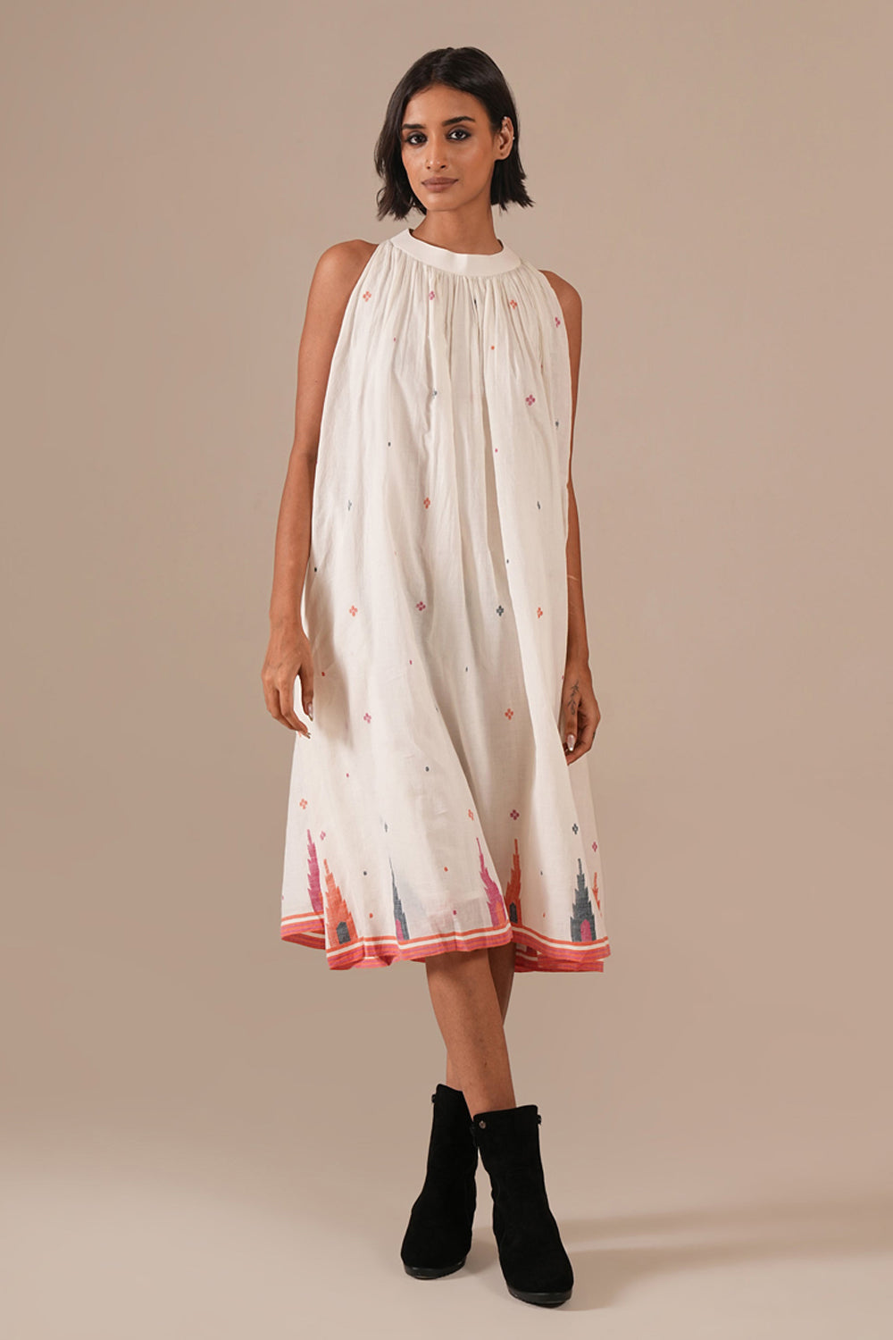 A classic jamdani gathered dress featuring halter neck, gentle gathers and back zipper is perfect for the summer wanderers. Handwoven by Indian artisans, the dress also comes with attached lining and side pockets.