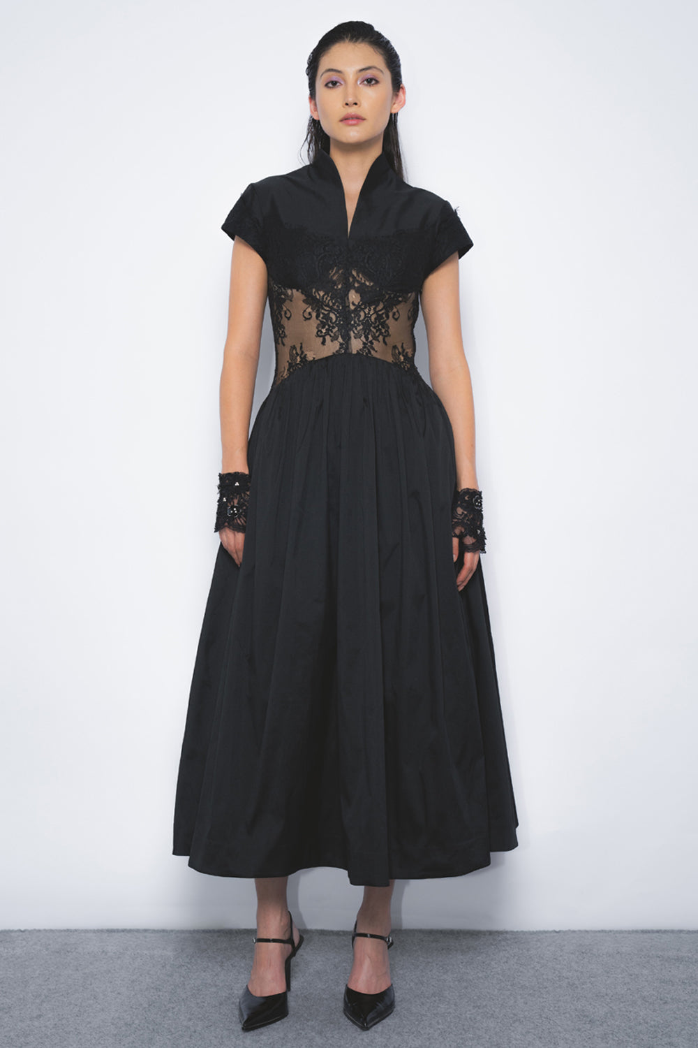 This silhouette embodies femininity, elegance and sensuality. A reinterpretation of Opera Dress, the ensemble features layered interplay of materials highlighted with lace overlay at the bodice creating a peek-a-boo detail at the waistline.