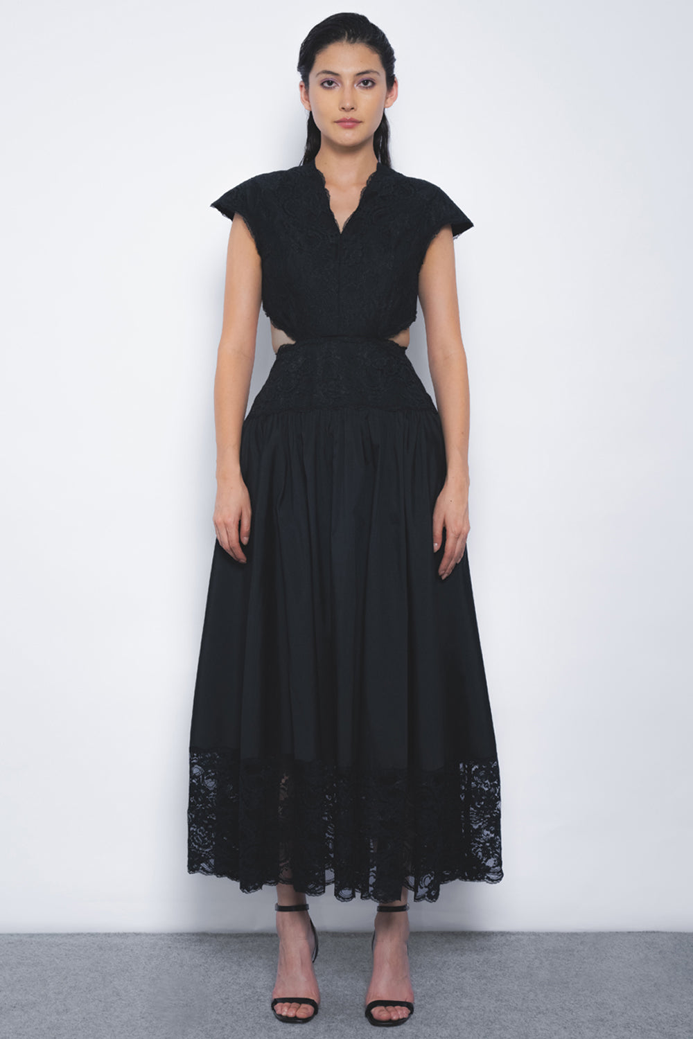 This garment merges a sharp, tailored cut with feminine, sensual details, seamlessly enhanced by lace accents layered over lustrous taffeta.
