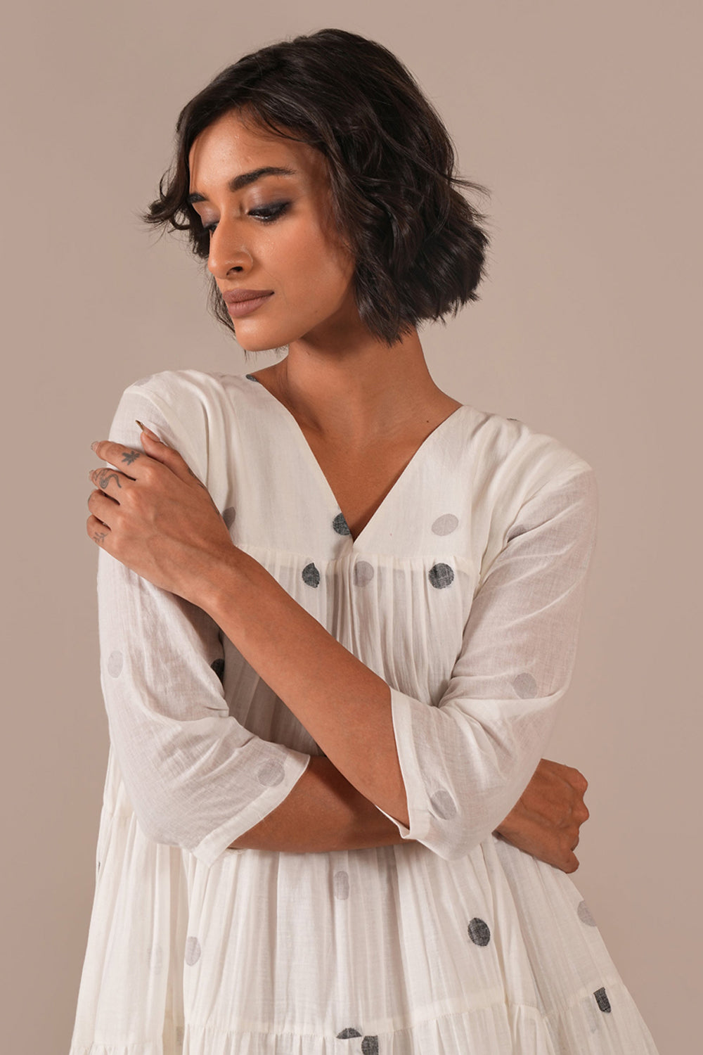 An elegant Jamdani swing dress designed to dazzle, featuring a V-neck, and 3/4th sleeves. With a romantic, voluminous silhouette crafted from 9 to 10 meters of gentle gathers, this dress flows beautifully, making every twirl and photograph a statement. Perfect for capturing the full drama and movement of your favourite moments.