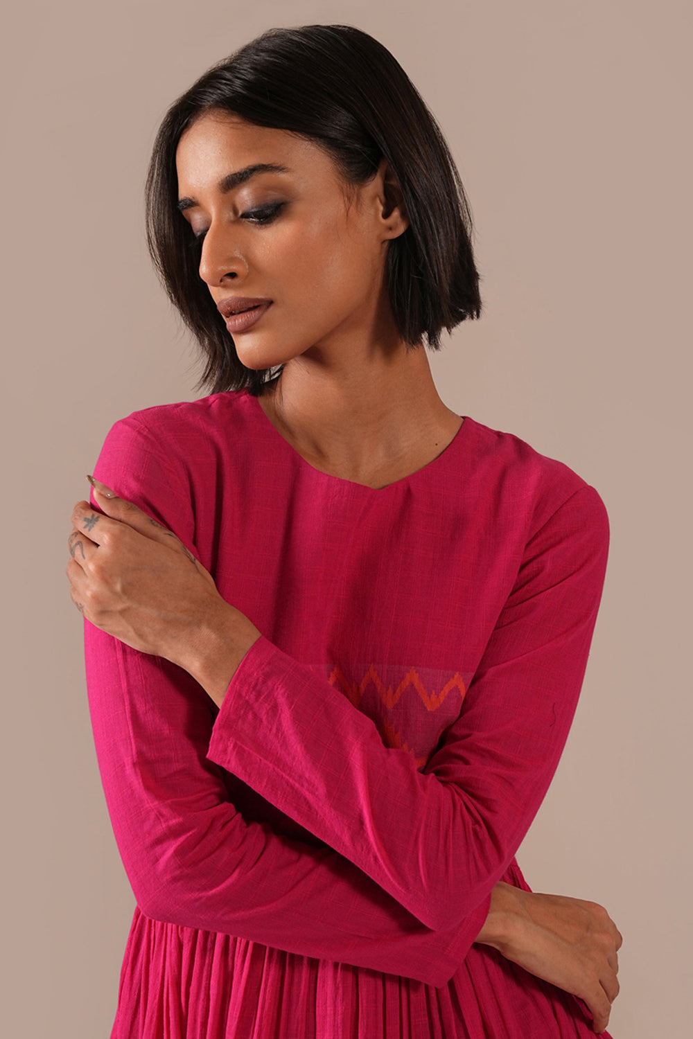 An attire that stands for its glamour and effortlessness features a fitted bodice, round neck, full sleeves, back zipper fastening, and skin-barring cut out at the waist that comes with a voluminous tiered silhouette. Handwoven by Indian artisans, the dress comes with side pockets.