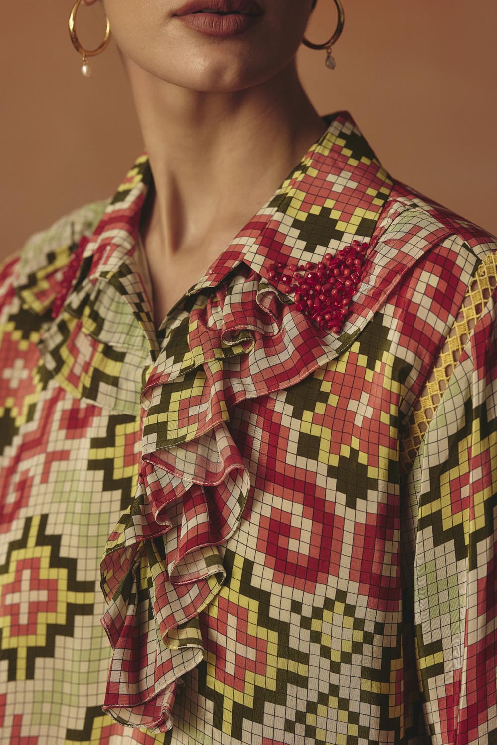 The Tara Frill Dress is made in pure crepe and comes in digitally printed ,Ikat-inspired pattern with full-sleeves and a collar. Its embellished with hand embroidered stone work on collar