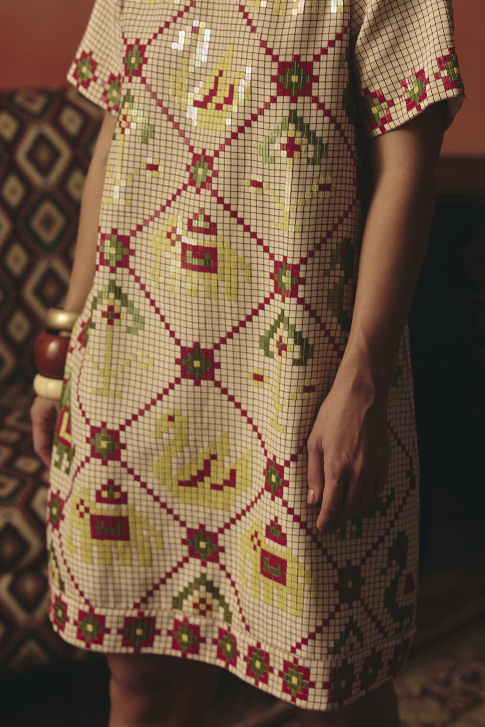 The Tota Maina Dress dress is crafted from pure crepe in the classic Ikat-inspired pattern and comes finished with our signature sequins hand work.