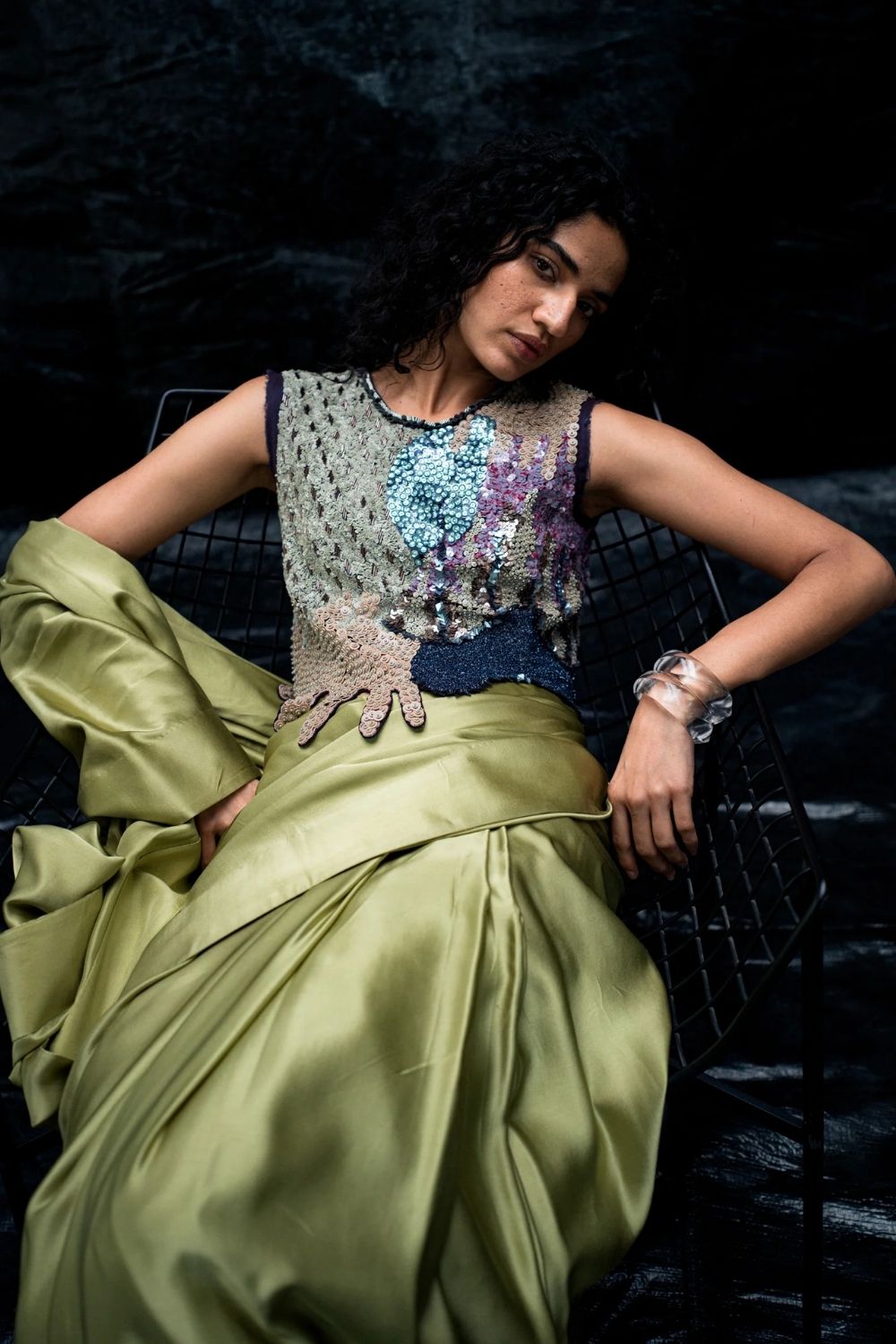 Multiples of sequin trickle in the moon fire blouse, meticulously hand-embellished marrying textures and tones. An asymmetrical, hand-beaded hem add to the detailing. Imagined as a saree blouse or a crop over GRAINE signature pants and skirts.