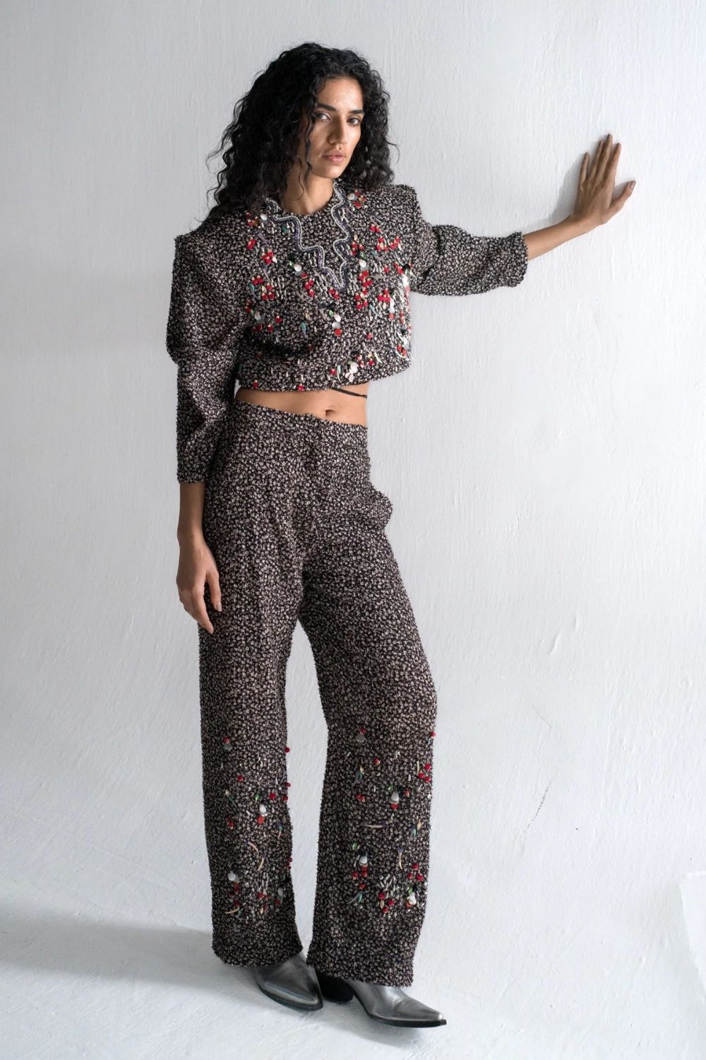 A comfortable, relaxed wide leg silhouette with an elastic waist at the back for comfort. The GRAINE metal button is a focal point. Red rain artwork is hand embeliished intricately on the textured trouser.