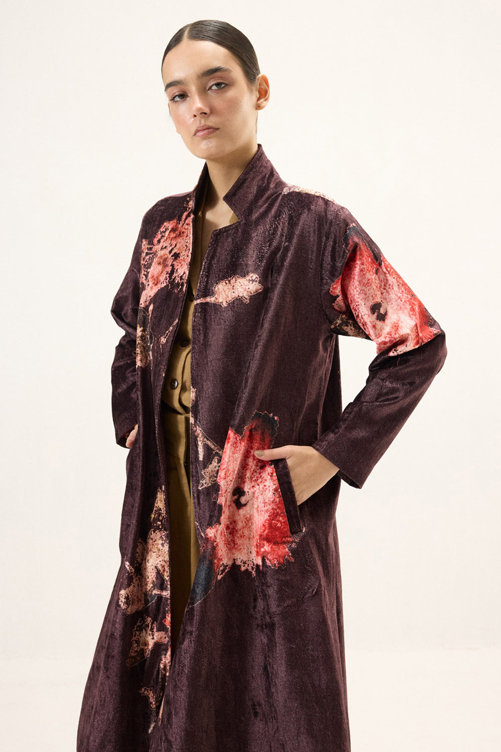 Crafted in plush purple velvet, this trench coat is a statement of modern elegance. The richness of the fabric brings depth and softness, while large floral prints add a bold yet graceful presence. Designed with full-length sleeves and a fluid drape, it layers effortlessly. Lining: Red Checkered Mul Lining.