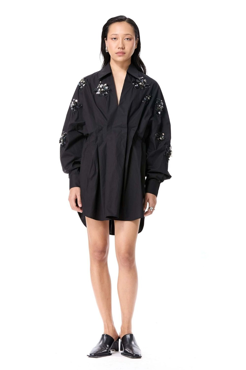 Black Embellished dress with cinched detailing.