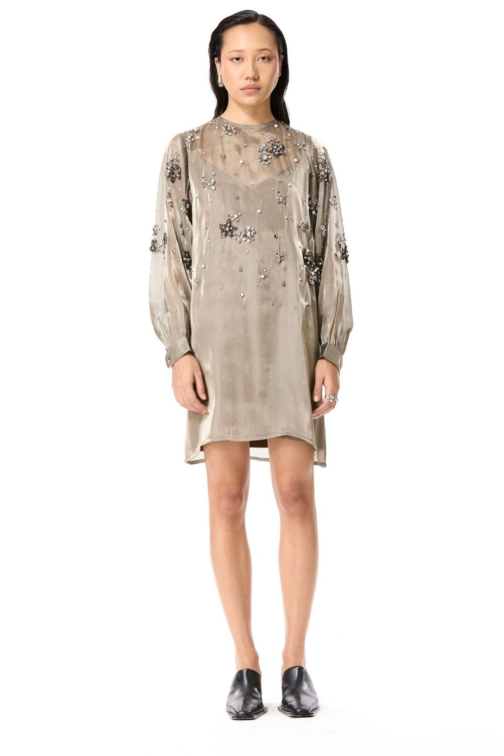 Beige hand-embellished overlay dress.