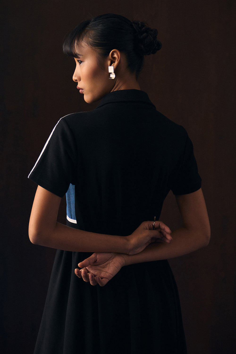 Featuring a black and denim dress with collar and front zip. It has stripes detailing on sleeves.