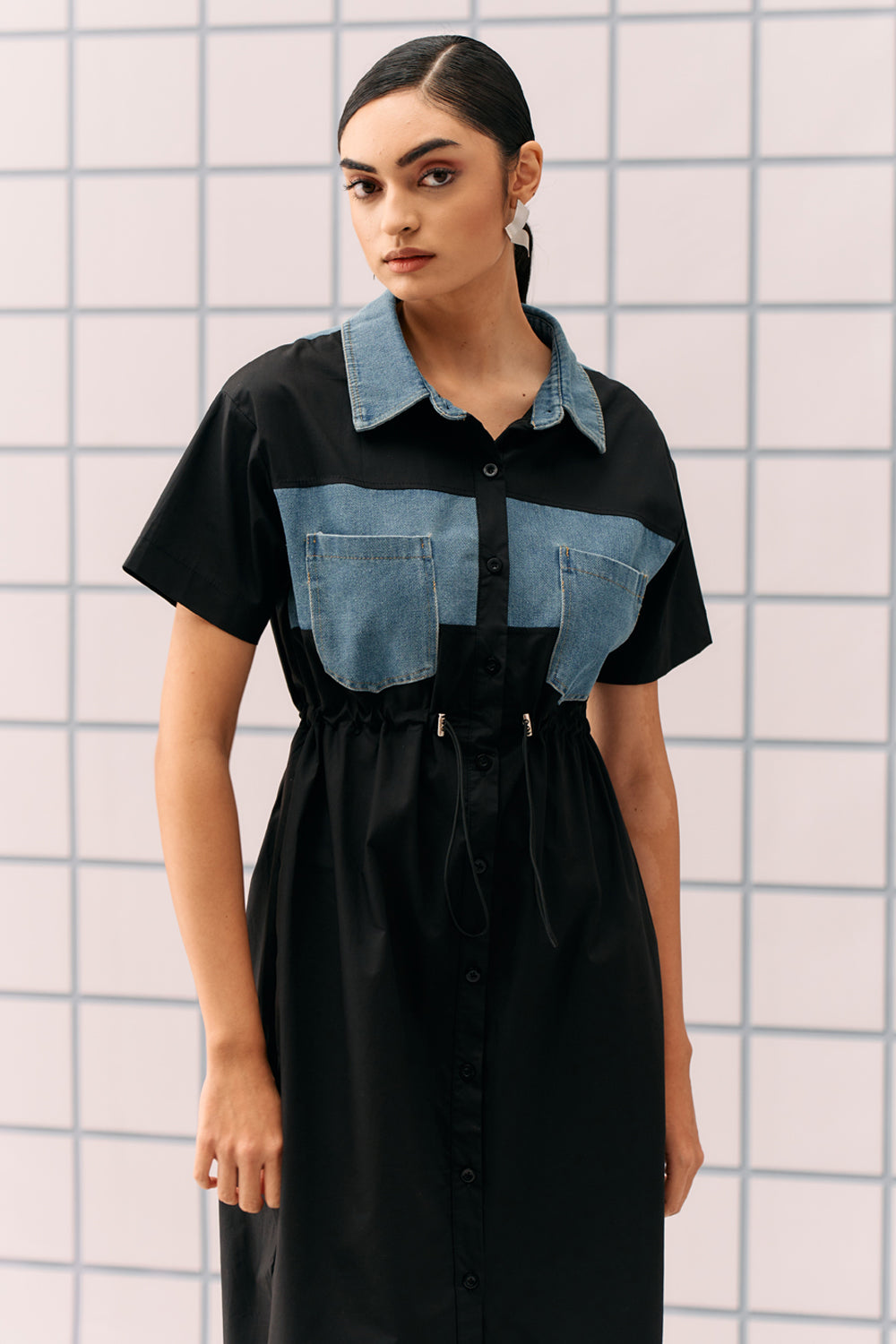 Featuring a black dress with denim collar and pocket detailing. It has a drawstring at waist for flattering fit.