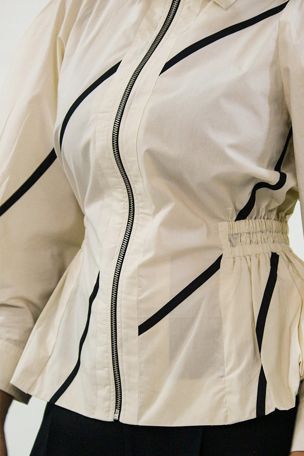 This bubble hem top features contrast stem tapes with full front zipper for easy wear, and a back elastic waistband that ensures both style and comfort, offering a fitted look with flexibility. The structured sleeves enhance the shape.