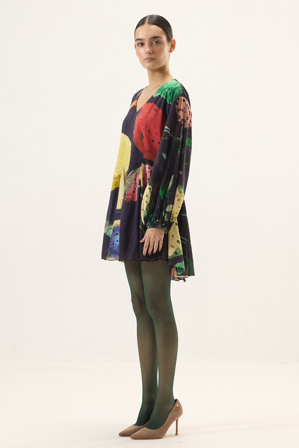 Crafted in airy cotton mul, this dress with a print in bold jewel tones over a deep base, moves with an effortless grace. Designed with a soft V neckline and full-length puff sleeves finished with gentle elasticated cuffs, it balances volume with ease. Godet panels at the hem create fluid flares that sway beautifully with every step, lending the silhouette a light, flowing charm, perfect for days that call for quiet elegance and comfort.