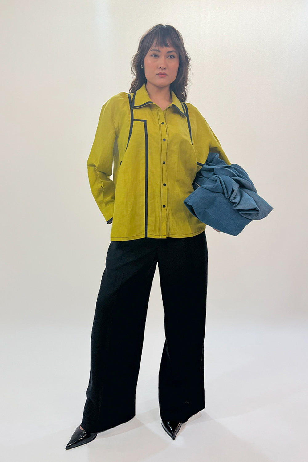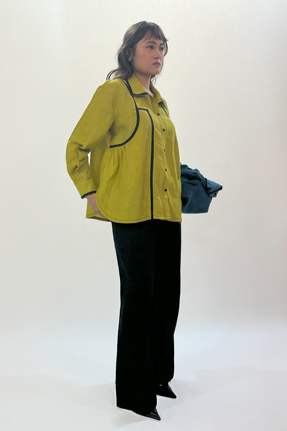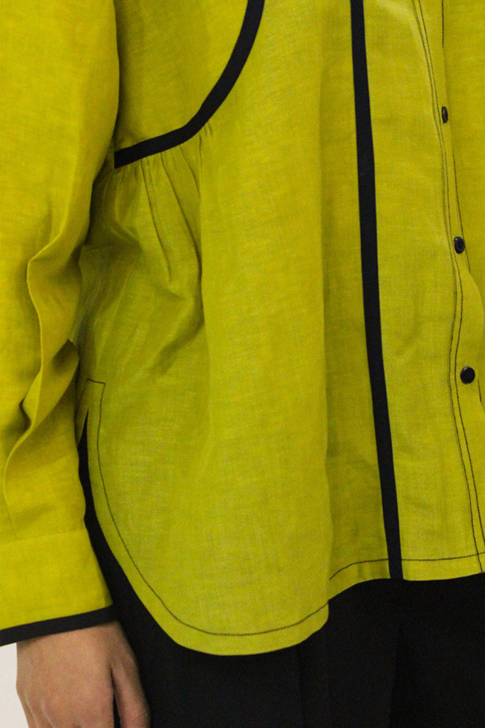 This shirt combines clean lines with subtle design details for a refined look. It features side slits with curved hemline. The contrast curved tapes with slight gathers that introduce a relaxed, comfortable element. Enhancing the overalll look with contrast tapes on the collar and cuffs, offering a crisp, polished finish.