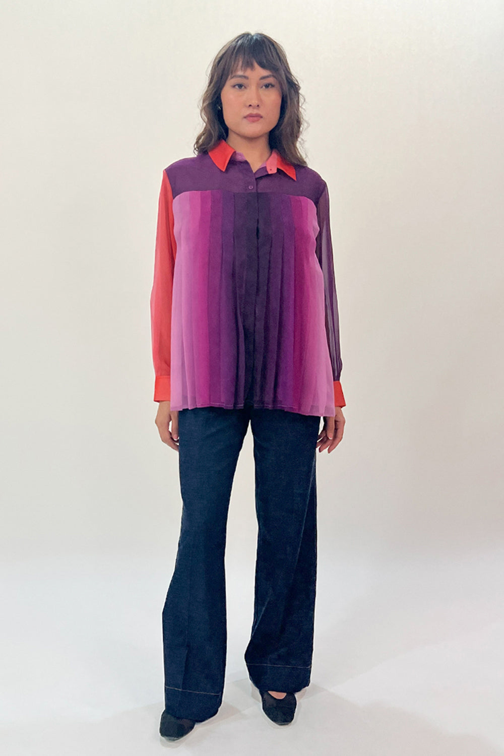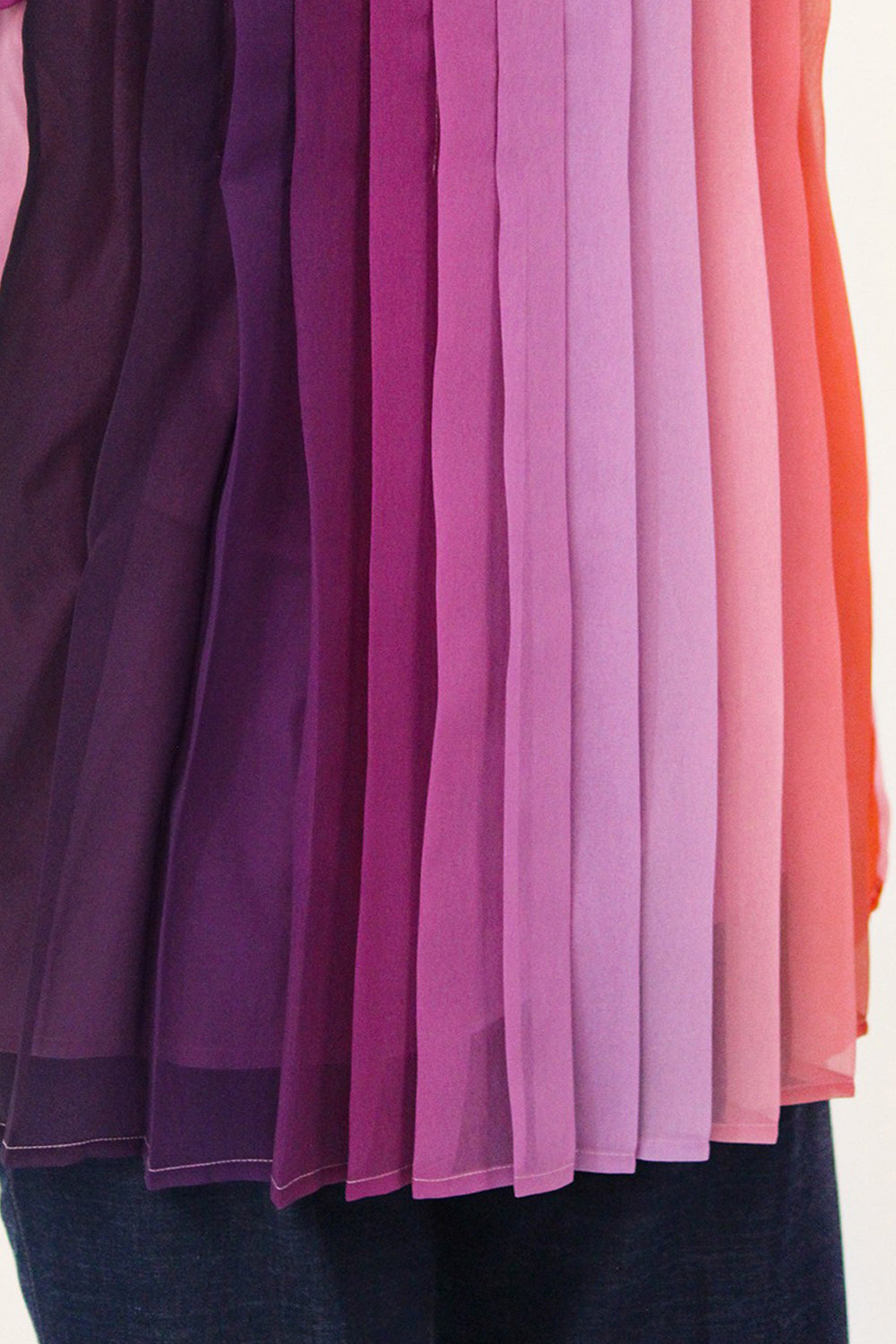 This gradient printed georgette top features a flowing, lightweight fabric with a smooth color transition. Delicate pleats begins at yoke, cascading down to the hem, creating an elegant silhouette.