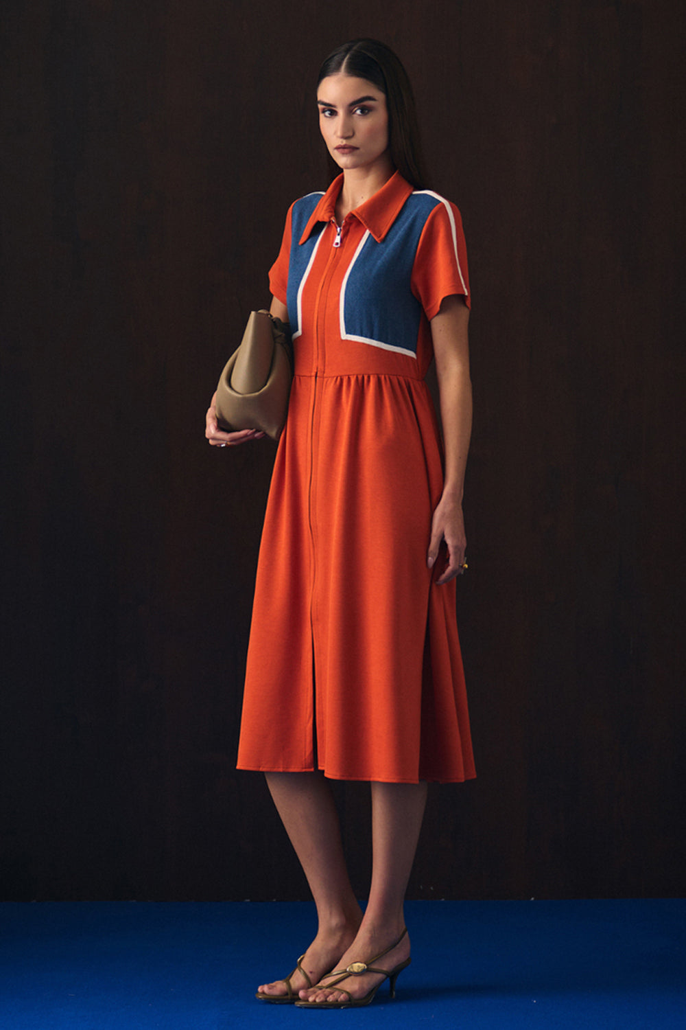 Featuring an orange and denim dress with collar and front zip. It has stripes detailing on sleeves.