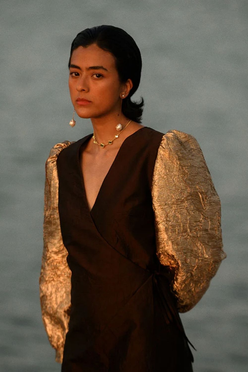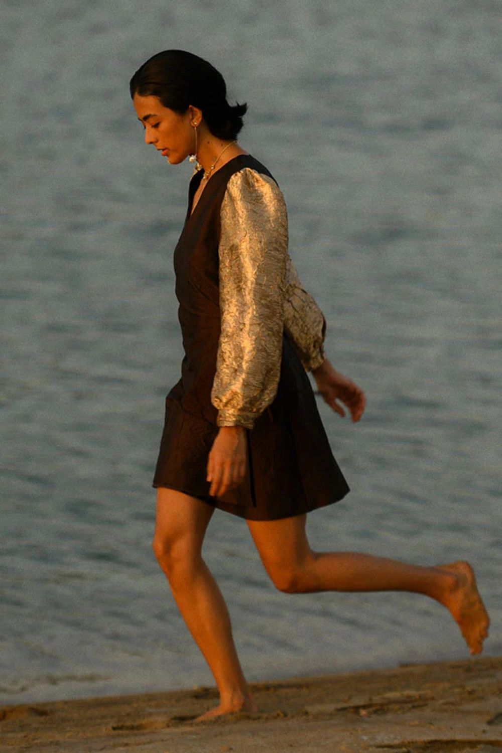 Crush fabric wrap dress with golden sleeves.
