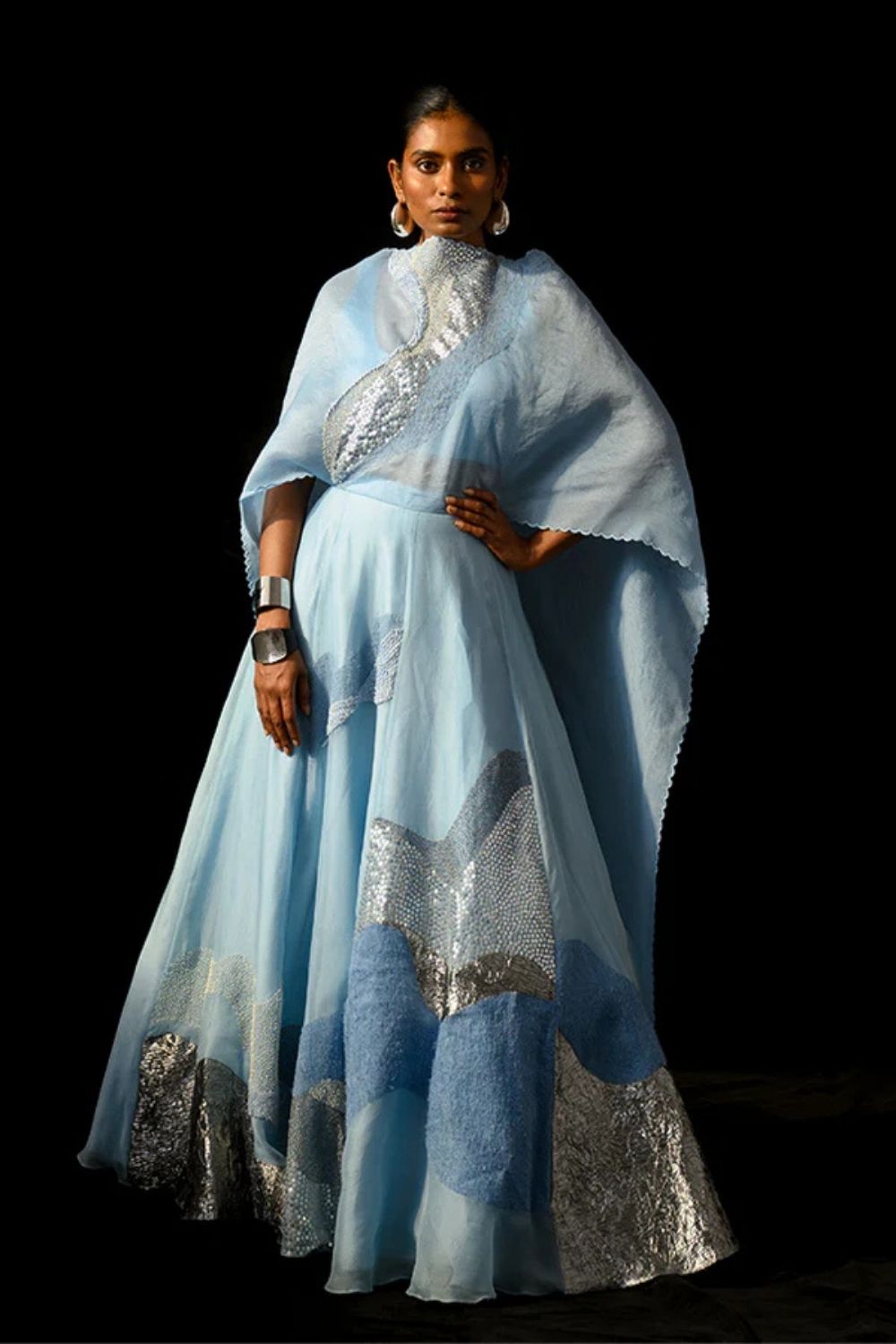 Blue scenery embroidered skirt with organza overlay attached & cotton lyrcra inner.