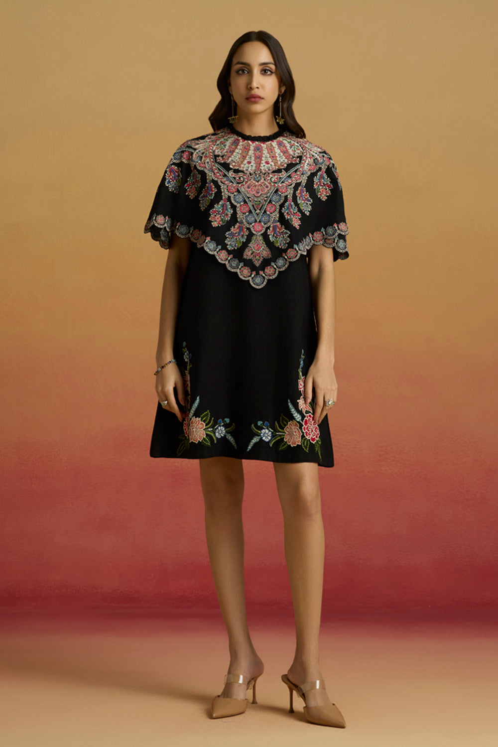 Black matka silk applique, threadwork and beadwork cape detail short dress.