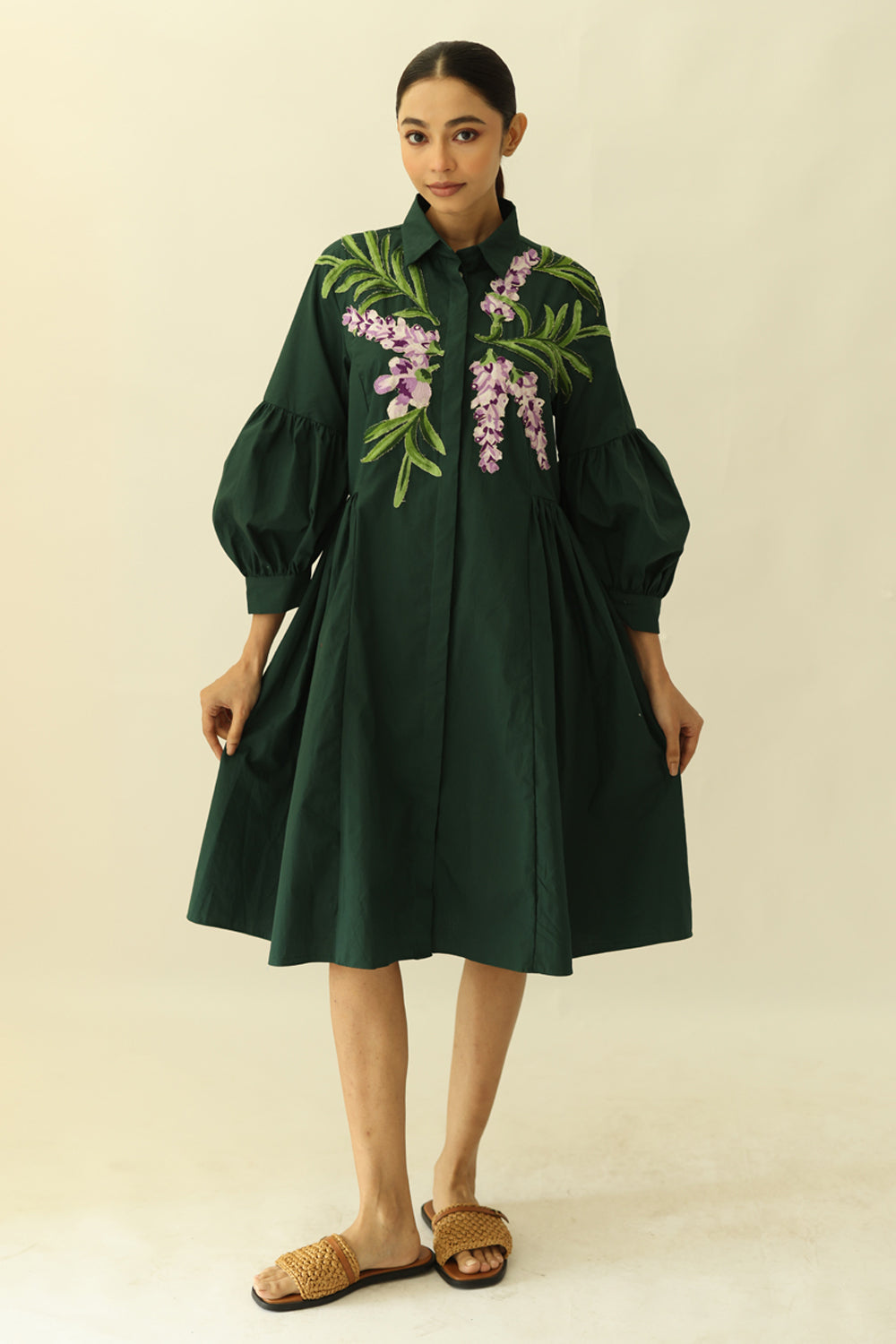 Panel dress with orchid embroidery.