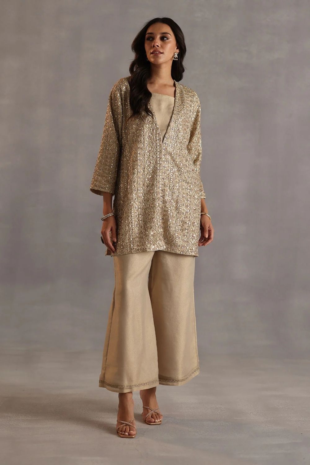 The Zari tissue kurta is adorned with cutdana, sequins, and zari embroidery that lend a subtle shimmer to its refined texture.