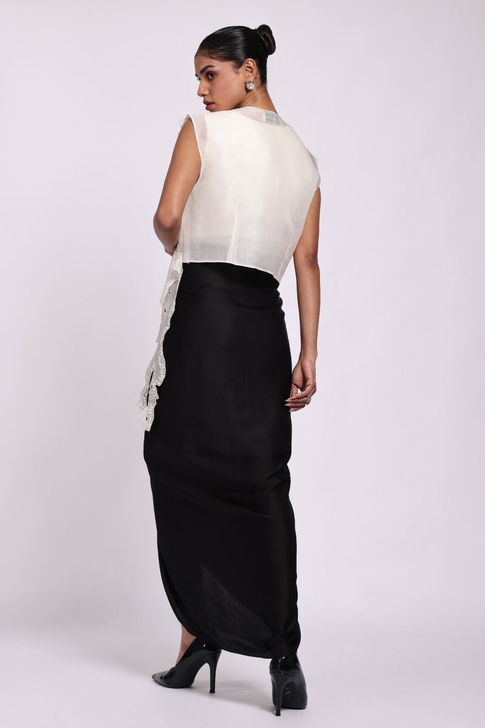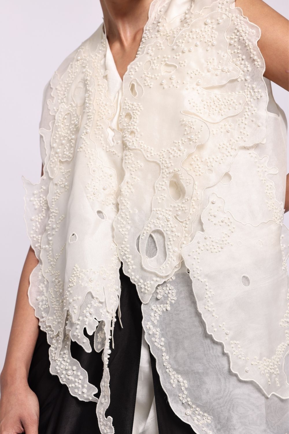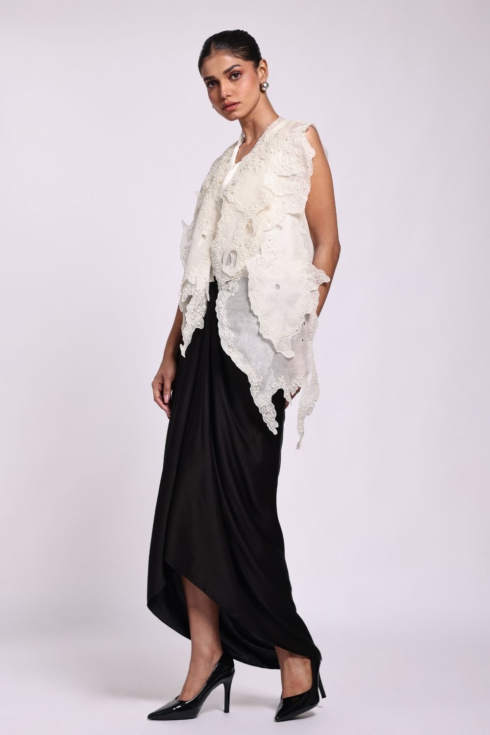 Ivory jacket with pearl applique embroidery and cowl sarong dress.