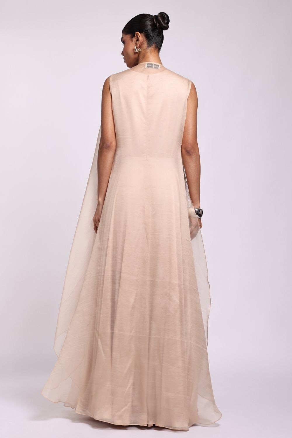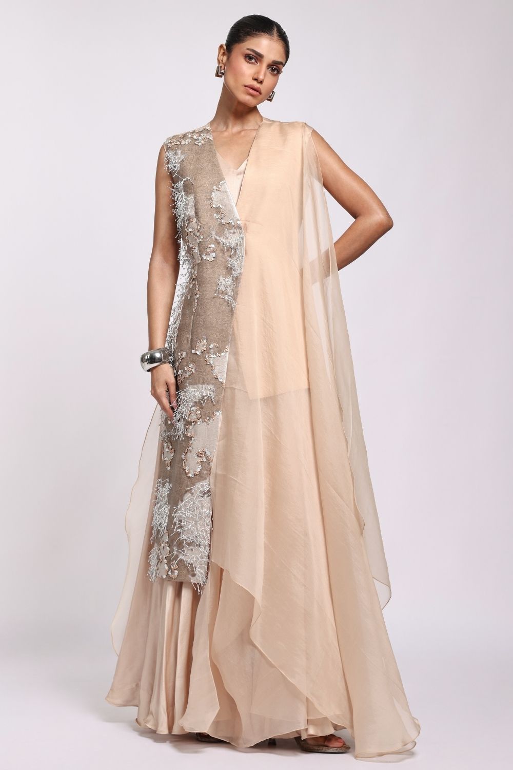 Printed jacket with hand embroidery on one side paired with gown and organza panel.