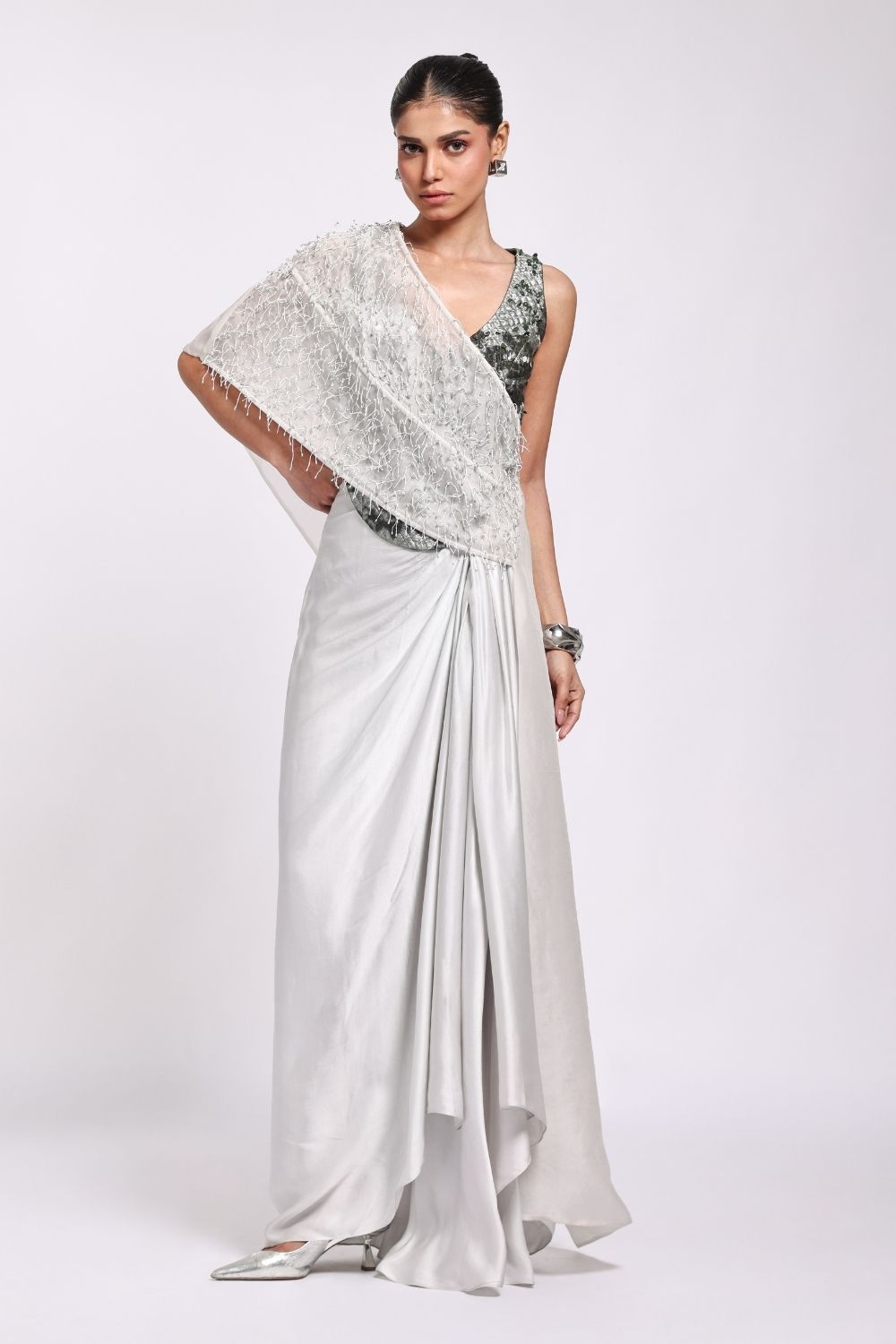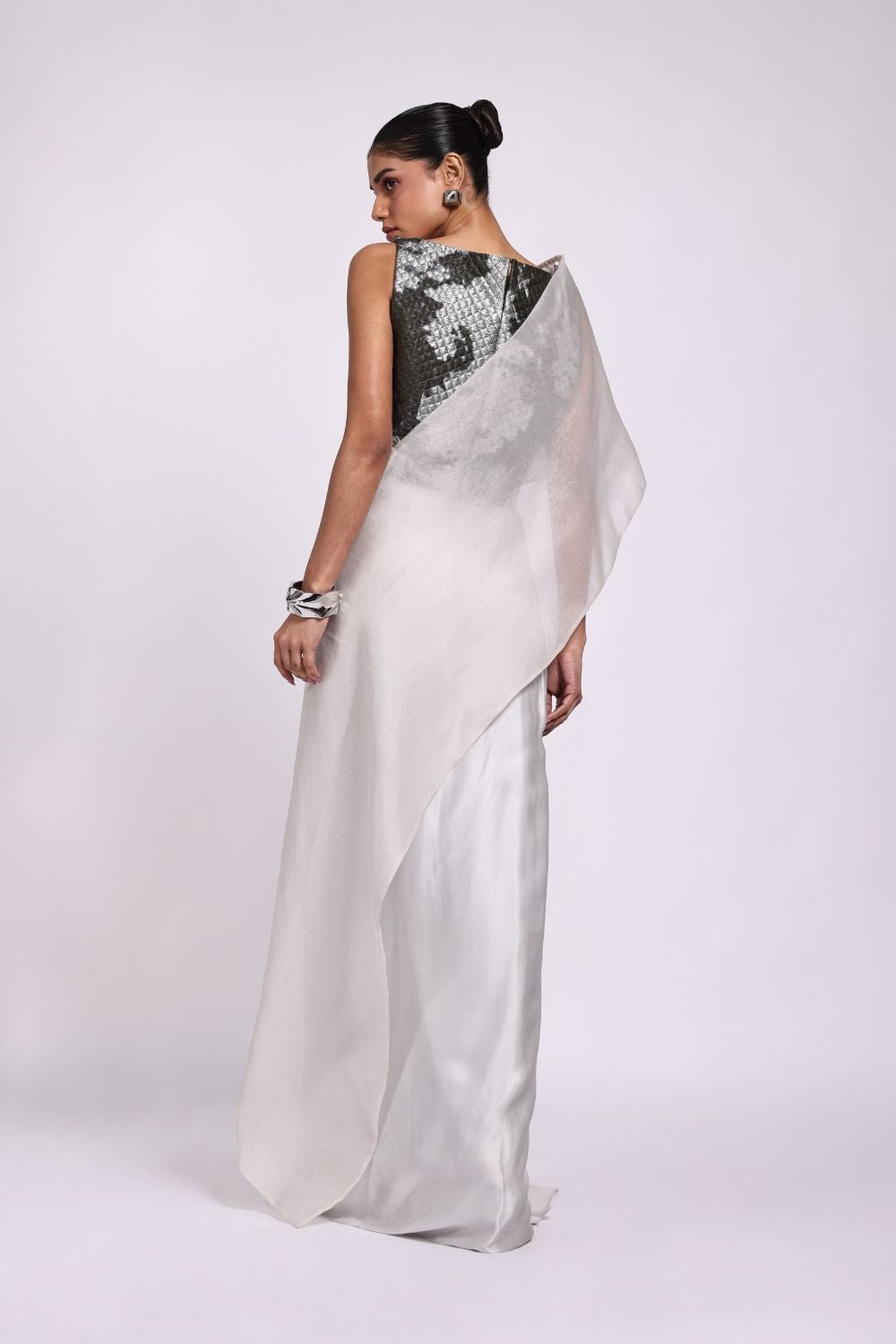 Hand embroidered structured drape with quilted top & old drape skirt.